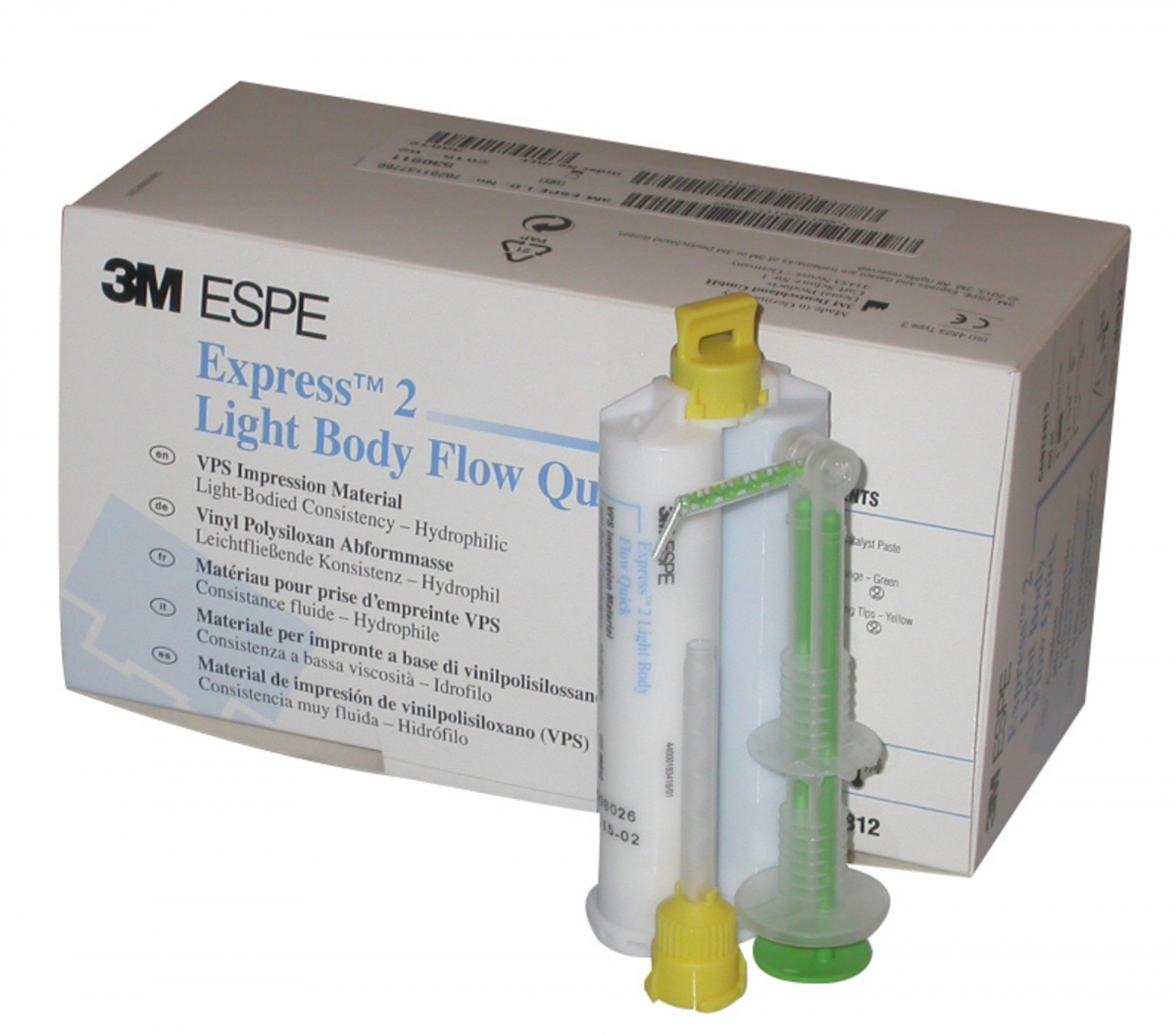 EXPRESS 2 LIGHT BODY FLOW QUICK Materiale ribasante ad indurimento rapido, caratterizzato da ottime proprietà di scorrimento: indicato sia per la tecnica ad una fase, che per la tecnica a due fasi. Miscelazione tramite dispenser Garant. Confezione: 4 cartucce da 50 ml cad. + 10 puntali miscelatori Garant gialli