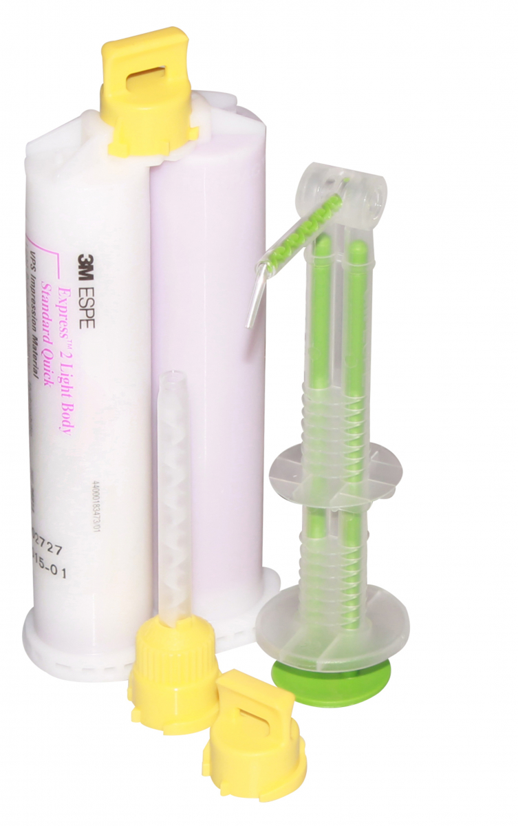 EXPRESS 2 LIGHT BODY STANDARD QUICK Materiale ribasante ad indurimento rapido, caratterizzato da un'elevata resistenza al gocciolamento: indicato per la tecnica ad una fase. Miscelazione con dispenser Garant. Confezione: 4 cartucce da 50 ml cad. + 10 puntali miscelatori Garant gialli