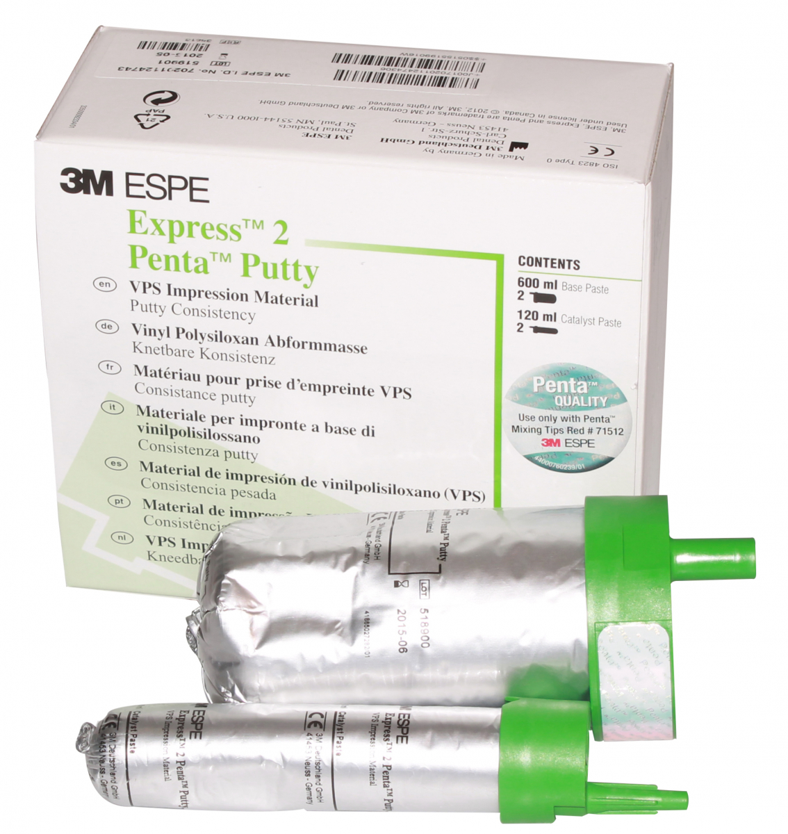 EXPRESS 2 PENTA PUTTY Materiale per impronta in VPS di ultima generazione che abbina i tipici vantaggi del putty (elevata pressione all'inserimento e malleabilità), ai vantaggi della miscelazione automatica con il sistema Pentamix, che assicura una qualità di miscelazione standardizzata, costantemente omogenea, priva di bolle d'aria, e garantisce un utilizzo semplice, pulito ed un dosaggio preciso. Express 2 Penta Putty è caratterizzato da un comportamento termoattivo (è già alla temperatura della bocca quando viene erogato con il sistema di miscelazione Pentamix), che accelera la polimerizzazione intraorale del ribasante (il tempo di indurimento intraorale viene abbreviato), mantenendone invariato il tempo di lavorazione. Indicato per la tecnica putty-wash a due fasi, in abbinamento al materiale ribasante Express 2 Ultra- Light Body Quick, e per la tecnica ad una fase, in abbinamento al materiale ribasante Express 2 Light Body Standard, assicura una accurata riproduzione dei dettagli. Confezione: 2 paste bas