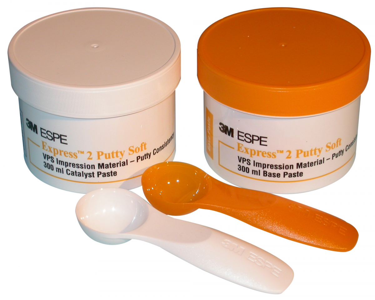 EXPRESS 2 PUTTY SOFT Nuovo putty a miscelazione manuale, a bassa rigidità finale. Ideale per la tecnica ad una fase. Confezione: 1 pasta base da 300 ml + 1 catalizzatore da 300 ml + 2 cucchiai per Putty