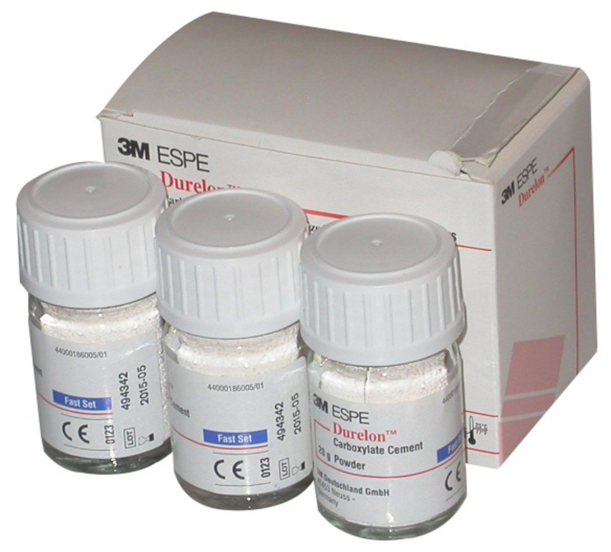 DURELON Cemento definitivo, policarbossilato, per il fissaggio di corone e ponti. INDURIMENTO RAPIDO Confezione: 3 flaconi da 20 gr cad.