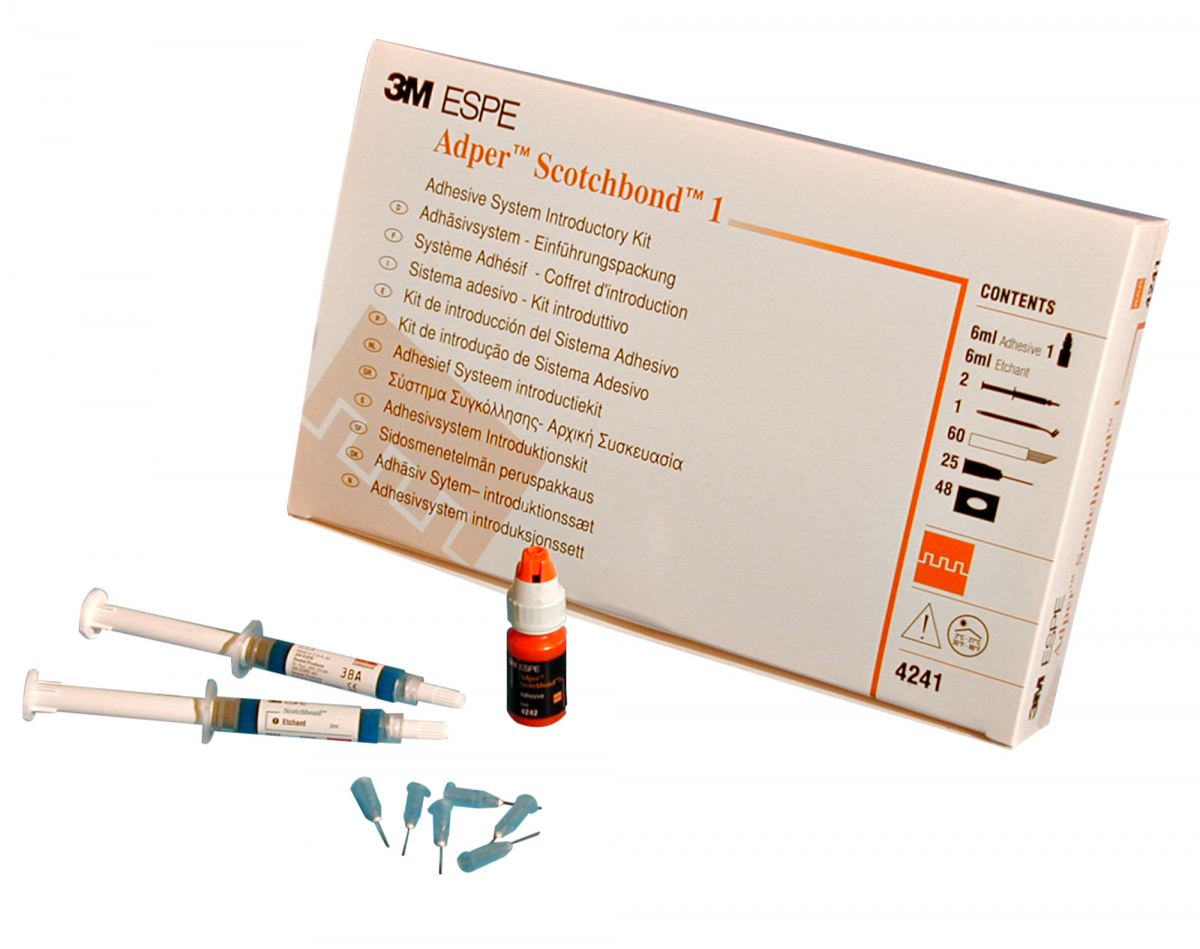 ADPER SCOTCHBOND 1 XT Nuovo adesivo monocomponente, fotopolimerizzabile. Ideale per cementazioni di restauri indiretti e per restauri diretti in composito. Permette l'adesione anche in campo umido. Kit: adesivo flaconcino da 6 ml + Scotchbond gel mordenzante 2 siringhe da 3 ml cad. + accessori