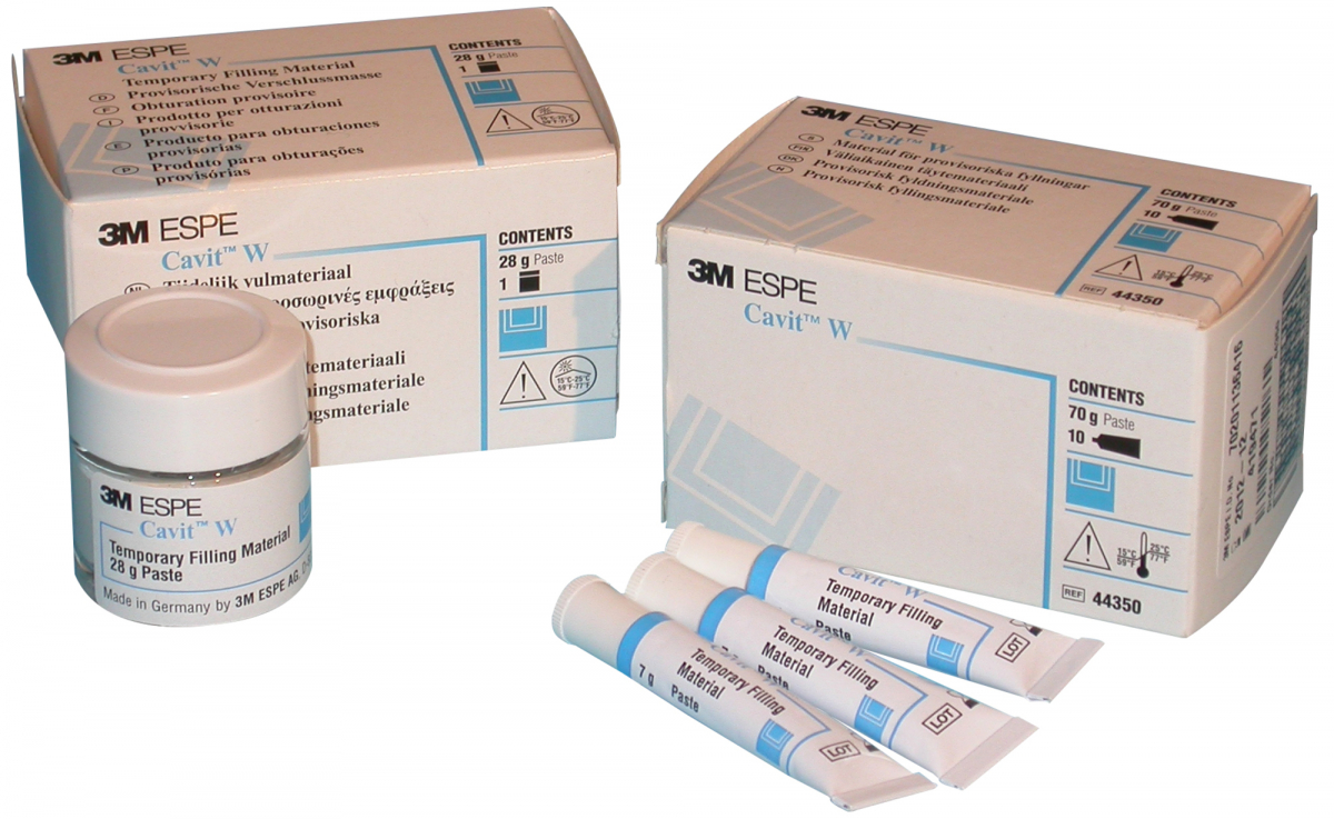 CAVIT W BIANCO Cemento radiopaco, autopolimerizzabile, per otturazioni provvisorie. A base di ossido di zinco, il tipo W bianco, è indicato per otturazioni di breve durata. Confezione: 10 tubi da 7 gr cad.