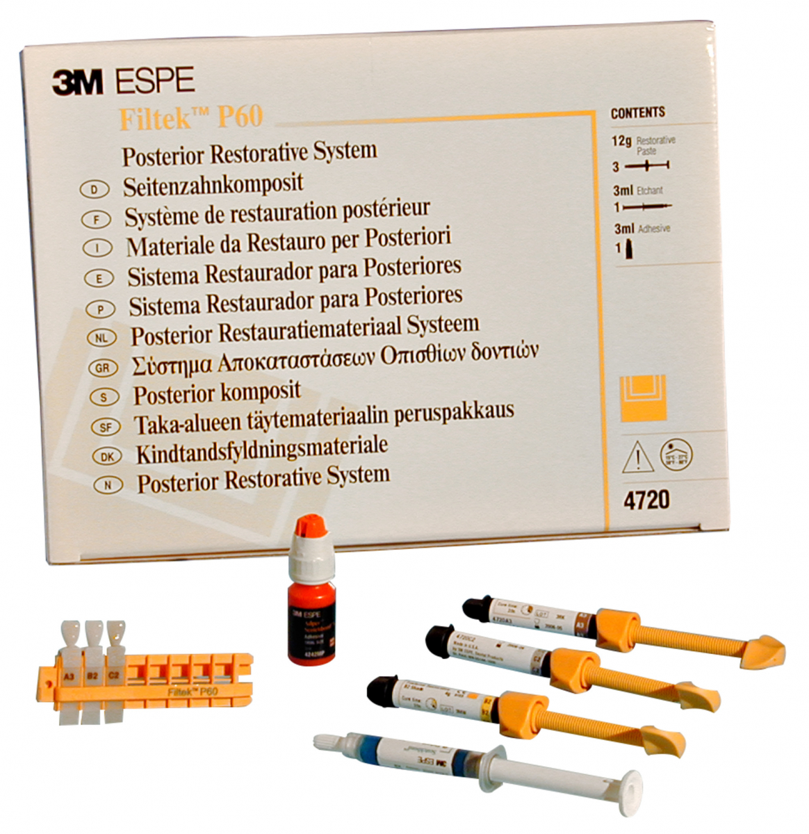 FILTEK P60 Composito fotopolimerizzabile per restauri diretti e indiretti nei settori latero posteriori. Caratterizzato da ottima modellabilità ed eccezionali caratteristiche fisiche. Kit introduttivo composto da: 3 siringhe da 4 gr cad. nei colori A3/B2/C2 + 1 siringa di mordenzante Scotchbond gel da 3 ml + 1 adesivo Scotchbond 1 da 3 ml + scala colori + accessori