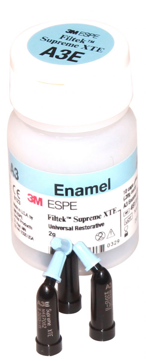 FILTEK SUPREME XTE Composito universale, basato sulla nanotecnologia, evoluzione di Filtek Supreme XT: versatilità, estetica e semplicità in un unico sistema. Caratterizzato da un'eccezionale lavorabilità, un'eccellente lucidabilità, una fluorescenza migliorata ed un'ottima adattabilità: mantenimento della lucentezza iniziale migliore di quella di un microriempito e notevole resistenza sia nei restauri anteriori che nei posteriori. Etichette più evidenti, con un codice colore per facile ed immediata identificazione, vasta gamma di colori e opacità per una tecnica ad una o più opacità. Indicato per restauri diretti nei settori anteriori e posteriori (tutte le classi comprese le superfici occlusali), ricostruzioni di monconi, splintaggi e restauri indiretti di anteriori e posteriori (compresi inlay, onlay e veneers). Confezione: 10 capsule da 0,2 gr cad. - enamel