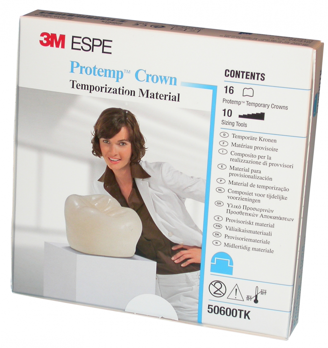 PROTEMP CROWN Corone singole in composito per posteriori e canini: preformate, pronte all'uso, fotopolimerizzabili, altamente estetiche. Facili da utilizzare: è possibile realizzare una corona provvisoria in soli 5 minuti senza l'utilizzo di matrici o impronte. Elevata resistenza alla compressione e resistenza meccanica superiore alla media. Procedimento semplice di soli quattro passaggi (selezionare la misura, adattare la corona scelta alle dimensioni richieste, fotopolimerizzare, cementare). Ogni corona è confezionata singolarmente. Trial Kit 16 corone: 6 molari superiori (3 large, 3 small) + 4 molari inferiori (2 large, 2 small) + 4 premolari superiori (2 large, 2 small) + 2 premolari inferiori + 10 strumenti per la misurazione