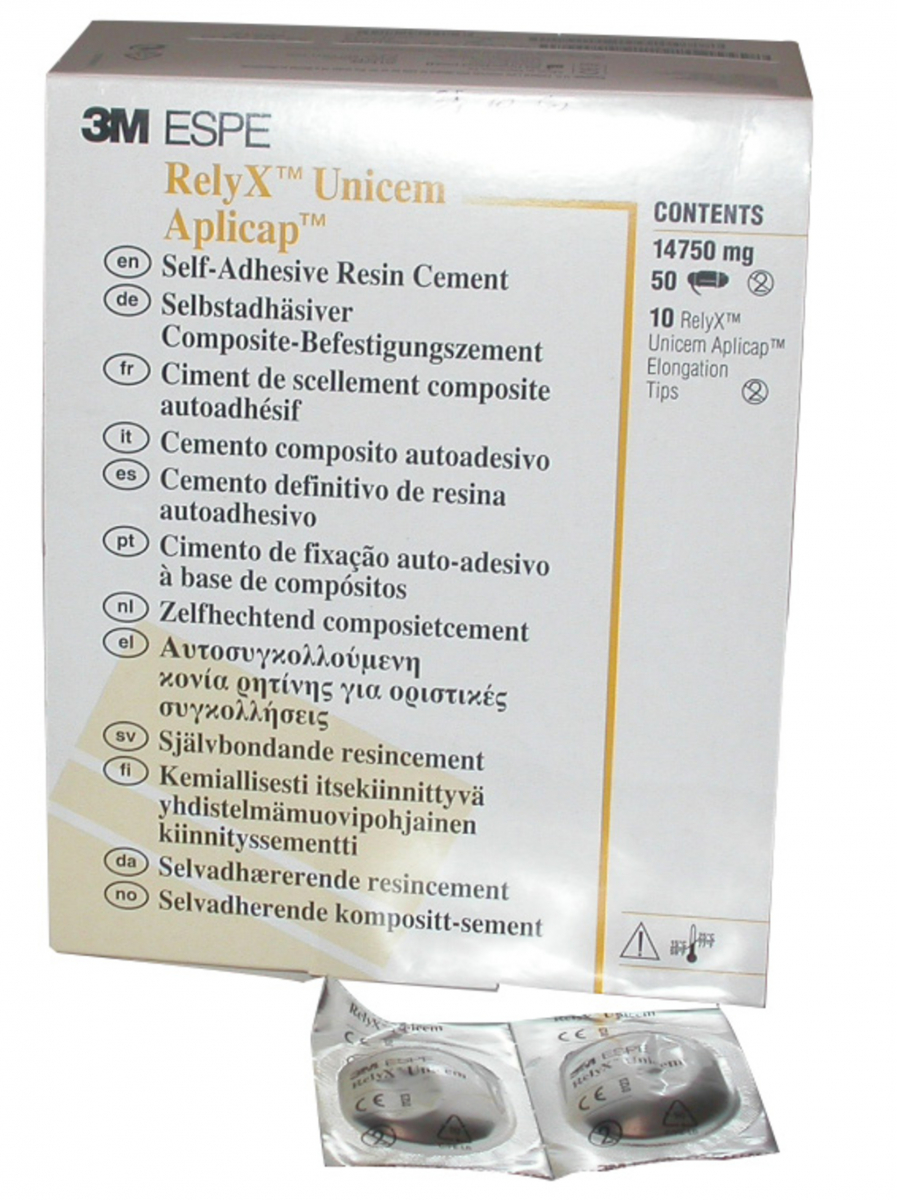 RELYX UNICEM APLICAP Cemento universale auto-fotopolimerizzabile, radiopaco, autoadesivo, per manufatti in metallo, ceramica e compositi. Ad elevata biocompatibilità, di lunga durata, è caratterizzato da una notevole forza di adesione e non necessita di alcun pre-trattamento (automordenzante). La versione Aplicap è indicata per cementazioni singole. Confezione Ricambio: 50 capsule