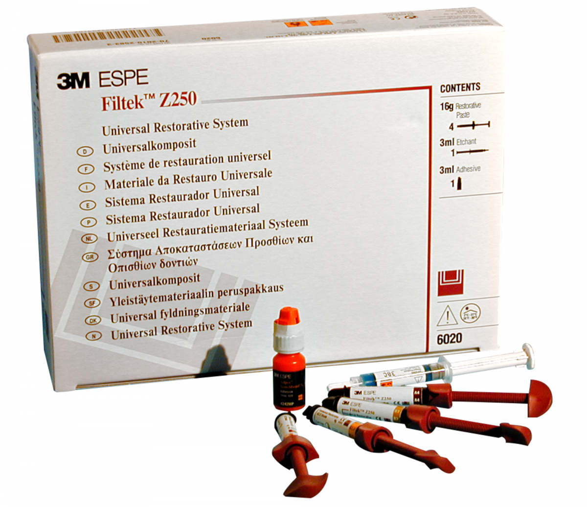 FILTEK Z250 - 3M Espe Composito ibrido fotopolimerizzabile universale per resta uri estetici diretti e indiretti. Di fa cile modellabilità e di rapida applicazi one. Kit Intro siringhe composto da: 4 s iringhe da 4 GR cad. nei colori A2/A3,5/ A4/B3 + 1 siringa di Scotchbond gel mord enzante da 3 ML + 1 flacone di adesivo Scotchbond 1 da 3 ML + accessori