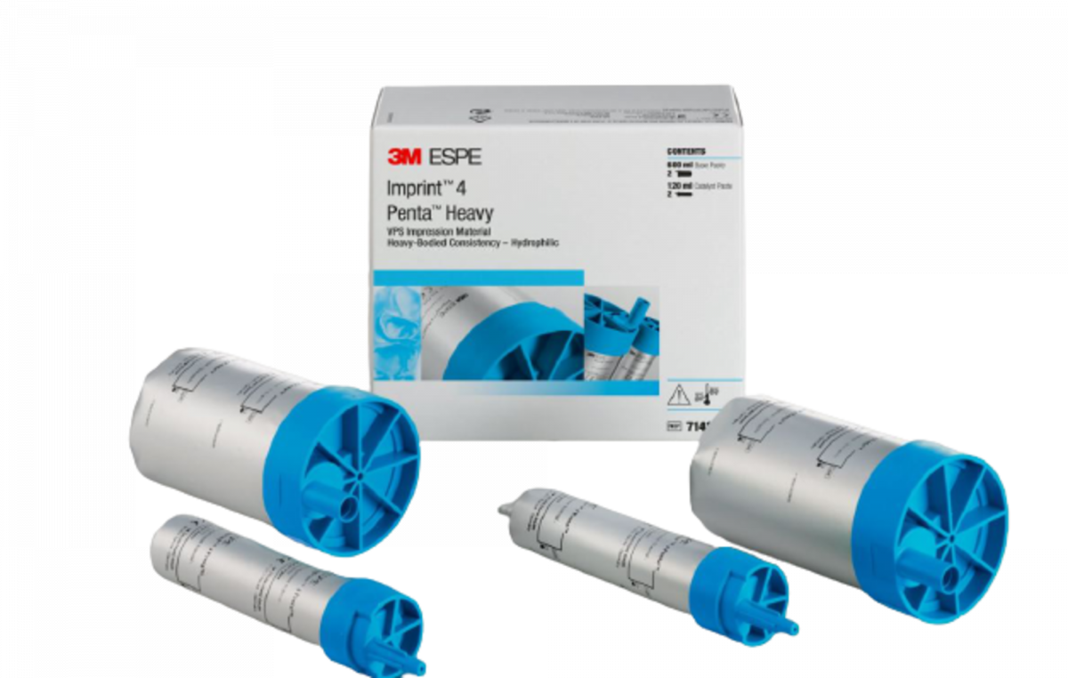 IMPRINT 4 Materiale da impronta in VPS che grazie all'azione autoriscaldante attiva, presenta un tempo di indurimento intraorale estremamente breve e quindi assicura un notevole risparmio di tempo durante la procedura di rilevamento dell'impronta. Caratterizzato da un'elevata idrofilia anche allo stato che precede l'indurimento, con la sua fluidità ottimale, cattura anche i minimi dettagli. Concepito specificamente per tutti i tipi di impronte di precisione con l'impiego delle tecniche a una e a due fasi: impronte per corone e ponti, inlay e onlay, impianti e impronte ortodontiche. Disponibile con due modalità di indurimento: i materiali a indurimento super rapido "Super Quick" sono la soluzione ideale per impronte di 1-2 elementi, mentre le versioni a indurimento normale "Regular" presentano tempi di lavoro più prolungati, pertanto sono perfette per più elementi. Confezione: 2 paste base da 300 ml cad. + 2 catalizzatori da 60 ml cad. Tipo: Penta Heavy