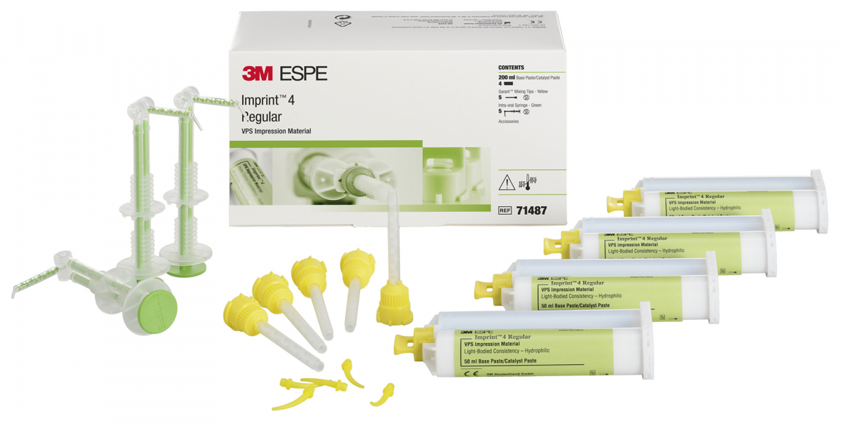 IMPRINT 4 Materiale da impronta in VPS che grazie all'azione autoriscaldante attiva, presenta un tempo di indurimento intraorale estremamente breve e quindi assicura un notevole risparmio di tempo durante la procedura di rilevamento dell'impronta. Caratterizzato da un'elevata idrofilia anche allo stato che precede l'indurimento, con la sua fluidità ottimale, cattura anche i minimi dettagli. Concepito specificamente per tutti i tipi di impronte di precisione con l'impiego delle tecniche a una e a due fasi: impronte per corone e ponti, inlay e onlay, impianti e impronte ortodontiche. Disponibile con due modalità di indurimento: i materiali a indurimento super rapido "Super Quick" sono la soluzione ideale per impronte di 1-2 elementi, mentre le versioni a indurimento normale "Regular" presentano tempi di lavoro più prolungati, pertanto sono perfette per più elementi. Confezione: 4 cartucce da 50 ml cad. + 5 puntali miscelatori Garant gialli + 5 siringhe intraorali verdi VERSIONE A INDURIMENTO "REGULAR". Tipo: Re