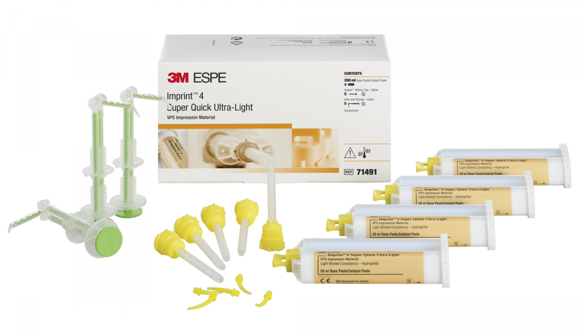 IMPRINT 4 Materiale da impronta in VPS che grazie all'azione autoriscaldante attiva, presenta un tempo di indurimento intraorale estremamente breve e quindi assicura un notevole risparmio di tempo durante la procedura di rilevamento dell'impronta. Caratterizzato da un'elevata idrofilia anche allo stato che precede l'indurimento, con la sua fluidità ottimale, cattura anche i minimi dettagli. Concepito specificamente per tutti i tipi di impronte di precisione con l'impiego delle tecniche a una e a due fasi: impronte per corone e ponti, inlay e onlay, impianti e impronte ortodontiche. Disponibile con due modalità di indurimento: i materiali a indurimento super rapido "Super Quick" sono la soluzione ideale per impronte di 1-2 elementi, mentre le versioni a indurimento normale "Regular" presentano tempi di lavoro più prolungati, pertanto sono perfette per più elementi. Confezione: 4 cartucce da 50 ml cad. + 5 puntali miscelatori Garant gialli + 5 siringhe intraorali verdi VERSIONE A INDURIMENTO "SUPER QUICK". Tipo