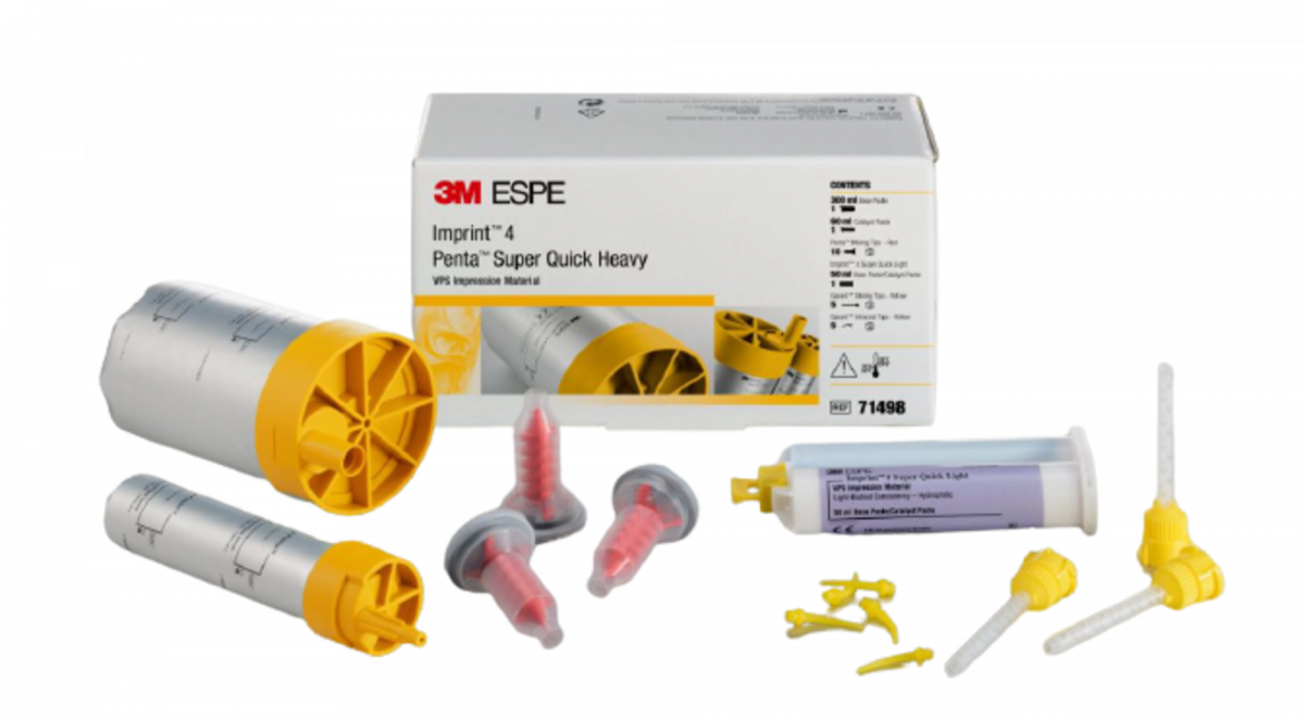 IMPRINT 4 Materiale da impronta in VPS che grazie all'azione autoriscaldante attiva, presenta un tempo di indurimento intraorale estremamente breve e quindi assicura un notevole risparmio di tempo durante la procedura di rilevamento dell'impronta. Caratterizzato da un'elevata idrofilia anche allo stato che precede l'indurimento, con la sua fluidità ottimale, cattura anche i minimi dettagli. Concepito specificamente per tutti i tipi di impronte di precisione con l'impiego delle tecniche a una e a due fasi: impronte per corone e ponti, inlay e onlay, impianti e impronte ortodontiche. Disponibile con due modalità di indurimento: i materiali a indurimento super rapido "Super Quick" sono la soluzione ideale per impronte di 1-2 elementi, mentre le versioni a indurimento normale "Regular" presentano tempi di lavoro più prolungati, pertanto sono perfette per più elementi. Penta Super Quick Heavy Trial Kit: 1 pasta base da 300 ml + 1 catalizzatore da 60 ml + 1 cartuccia Imprint 4 Super Quick Light da 50 ml + 10 puntal
