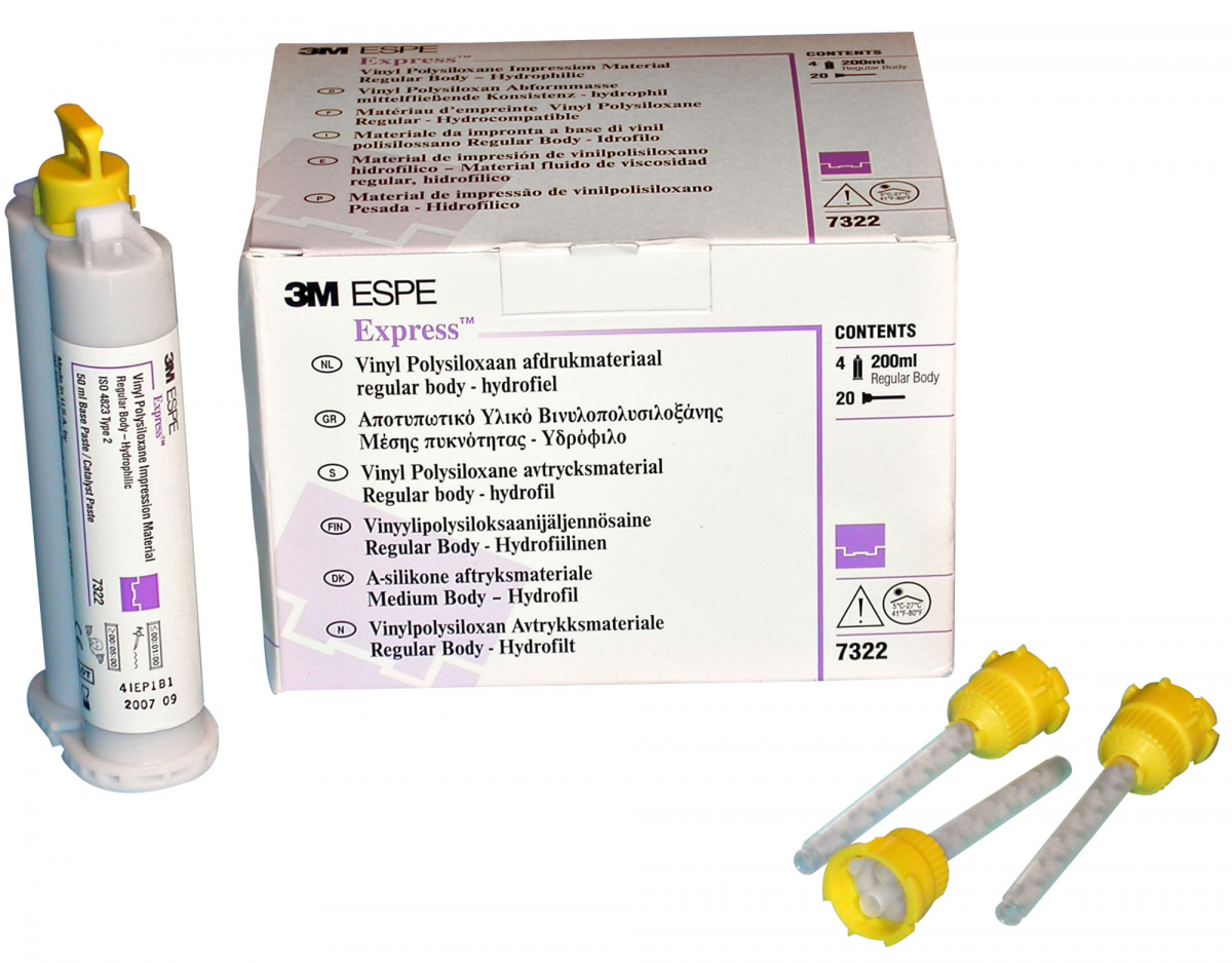 EXPRESS Silicone di tipo A, indicato per impronte a due fasi, a base di vinilpolisilossano. Caratterizzato da un'elevata stabilità dimensionale, consente di ottenere impronte precise e senza distorsioni. Confezione: 4 cartucce da 50 ml cad. + 20 puntali miscelatori REGULAR BODY Colore Porpora