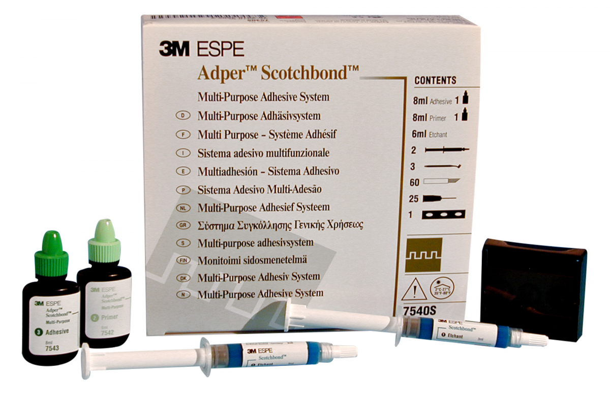ADPER SCOTCHBOND MP Sistema adesivo multifunzionale, bi-componente, auto e fotopolimerizzabile, per restauri diretti e indiretti. Confezione: acido ortofosforico in siringa 2x3 ml + primer da 8 ml + adesivo da 8 ml + accessori