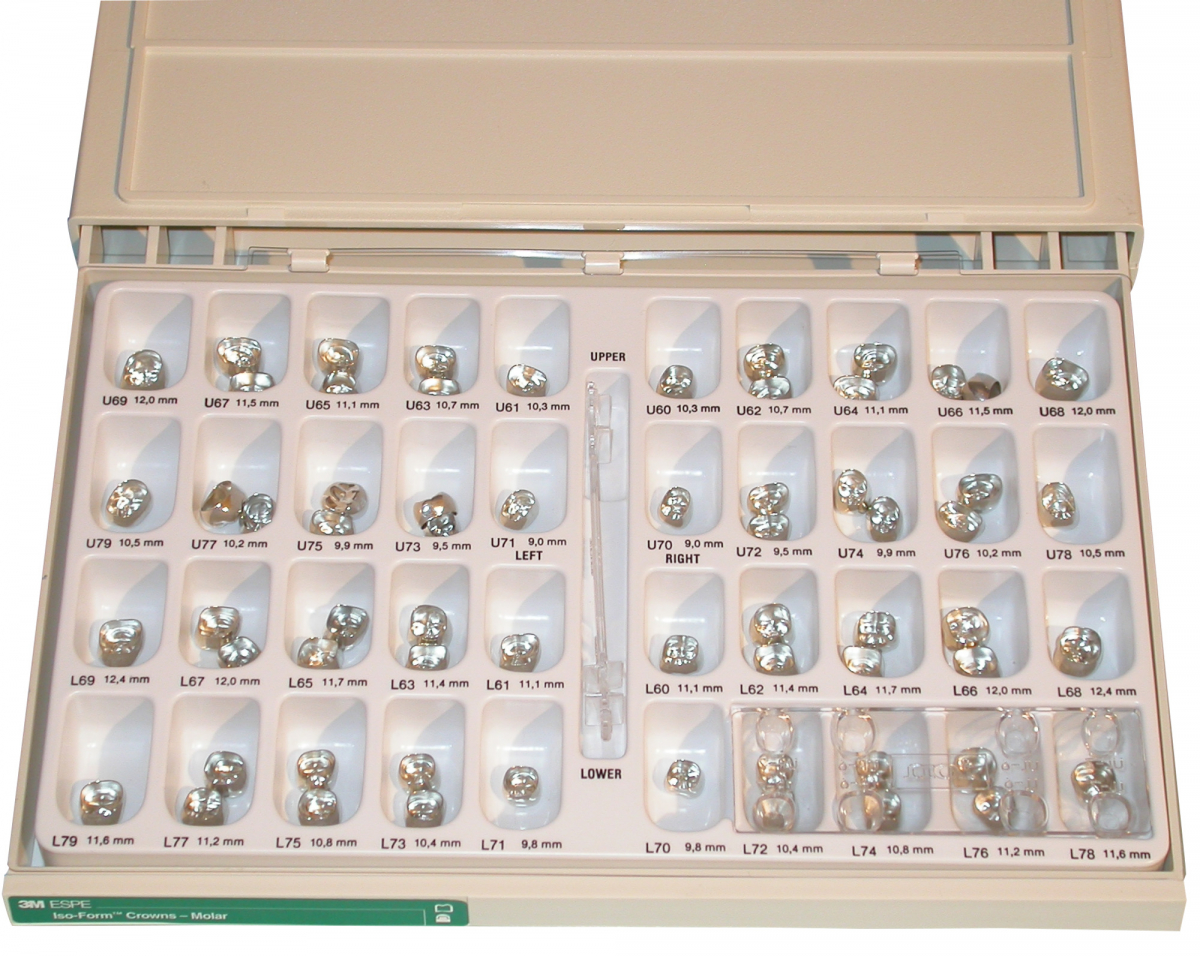 CORONE ISO-FORM Corone provvisorie anatomiche, per posteriori, in lega argento/stagno. Intro Kit Molari composto da 64 corone: 2 pezzi di ogni misura L62, L63, L64, L65, L66, L67, L72, L73, L74, L75, L76, L77, U62, U63, U64, U65, U66, U67, U72, U73, U74, U75, U76, U77, e 1 pezzo di ogni misura L60, L61, L68, L69, L70, L71, L78, L79, U60, U61, U68, U69, U70, U71, U78, U79