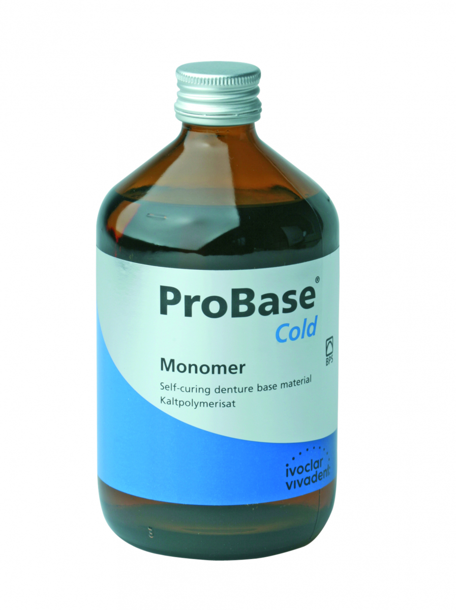 PROBASE COLD Resina autopolimerizzante a freddo, per protesi parziale e combinata, per protesi totale, per riparazioni e per ribasature. Si distingue per le eccezionali proprietà di scorrimento e modellazione; impiegabile nella tecnica di colaggio e di zeppatura, stabile nella forma e nel colore. Liquido da 1 Lt