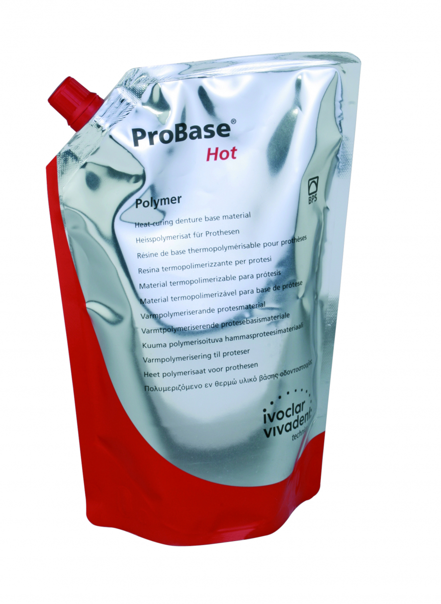 PROBASE HOT - Ivoclar Vivadent Resina acrilica polimerizzabile a caldo, indicata per protesi totale, protesi pa rziale e combinata, protesi ibrida, riba sature, restauri supportati da impianti. Impiegabile con diverse metodiche di p olimerizzazione nella tecnica di zeppatu ra, è caratterizzata da un'ottima lavora bilità: stabile nella forma e nel colore . Polvere da 500 gr
