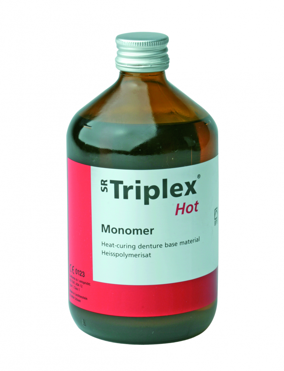 SR TRIPLEX HOT Resina per polimerizzazione a caldo indicata per protesi parziale, protesi combinata, ribasature, riparazioni. Semplice lavorazione, fedeltà e stabilità di colore e forma. Liquido da 500 ml.