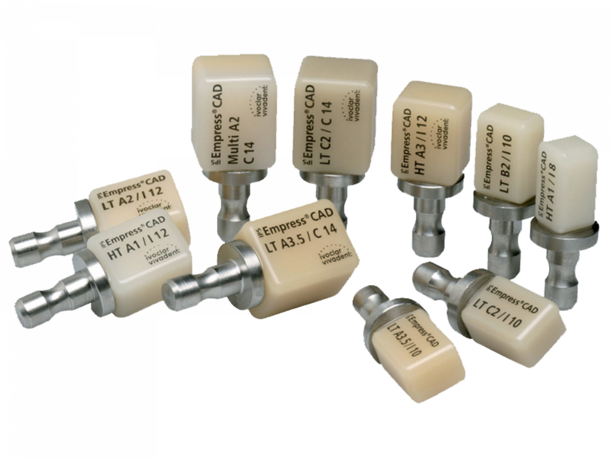 IPS EMPRESS CAD Blocchetti in vetroceramica rinforzati con leucite, per la realizzazione di singoli restauri. Disponibili: nella versione High (HT), che ha una gradazione di traslucenza molto alta, ideali nella realizzazione di piccoli restauri come inlay, onlay e faccette; nella versione Low (LT), che ha una gradazione di traslucenza più bassa rispetto a quella HT, si distinguono per un valore più elevato ed un croma naturale e si utilizzano per restauri più grandi come corone parziali e piene; infine i blocchetti nella versione Multi, che hanno un croma più elevato ed una opacità naturale in zona cervicale e dentinale ed in zona incisale la traslucenza desiderata, e sono ideali per la realizzazione di corone parziali, integrali e faccette. Confezione da 5 blocchetti