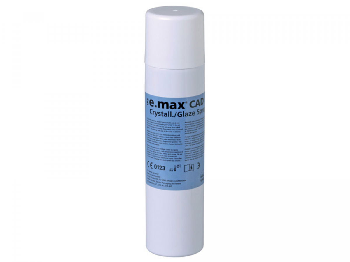 IPS e.max CAD Crystall./Glaze Spray Spray glasura speciale per l'impiego con restauri IPS e.max CAD interamente anatomici. La glasura in spray si applica dopo l'impiego di IPS e.max CAD Crystall./Shade e Stains. Flacone da 270 ml