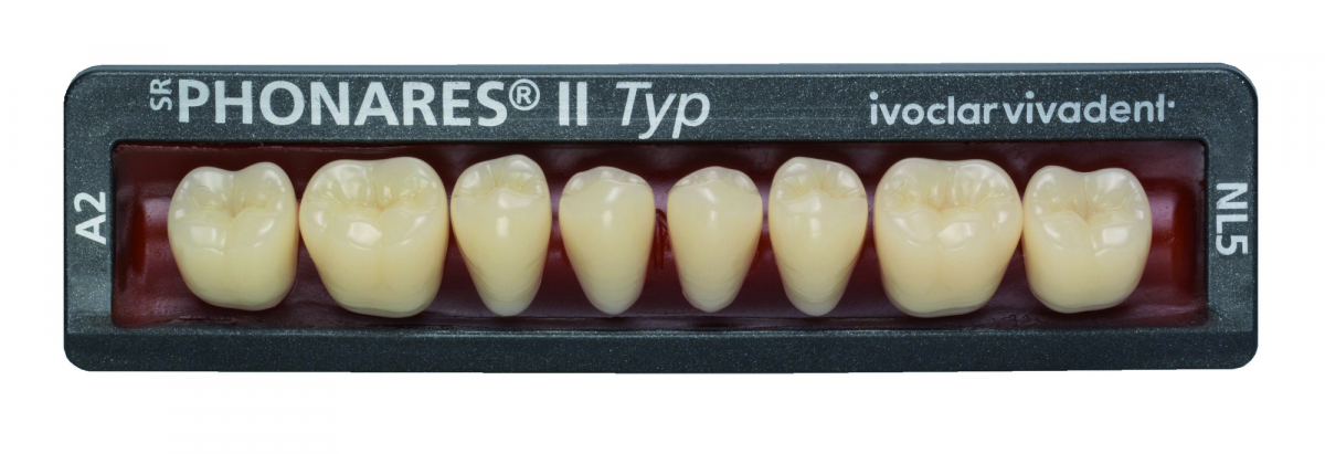 SR Phonares II Typ è stato realizzato nello stesso composito ibrido come il dente anteriore. La forma è semianatomica e concepita per la metodica di montaggio classica, rapporto di occlusione un dente a due denti.