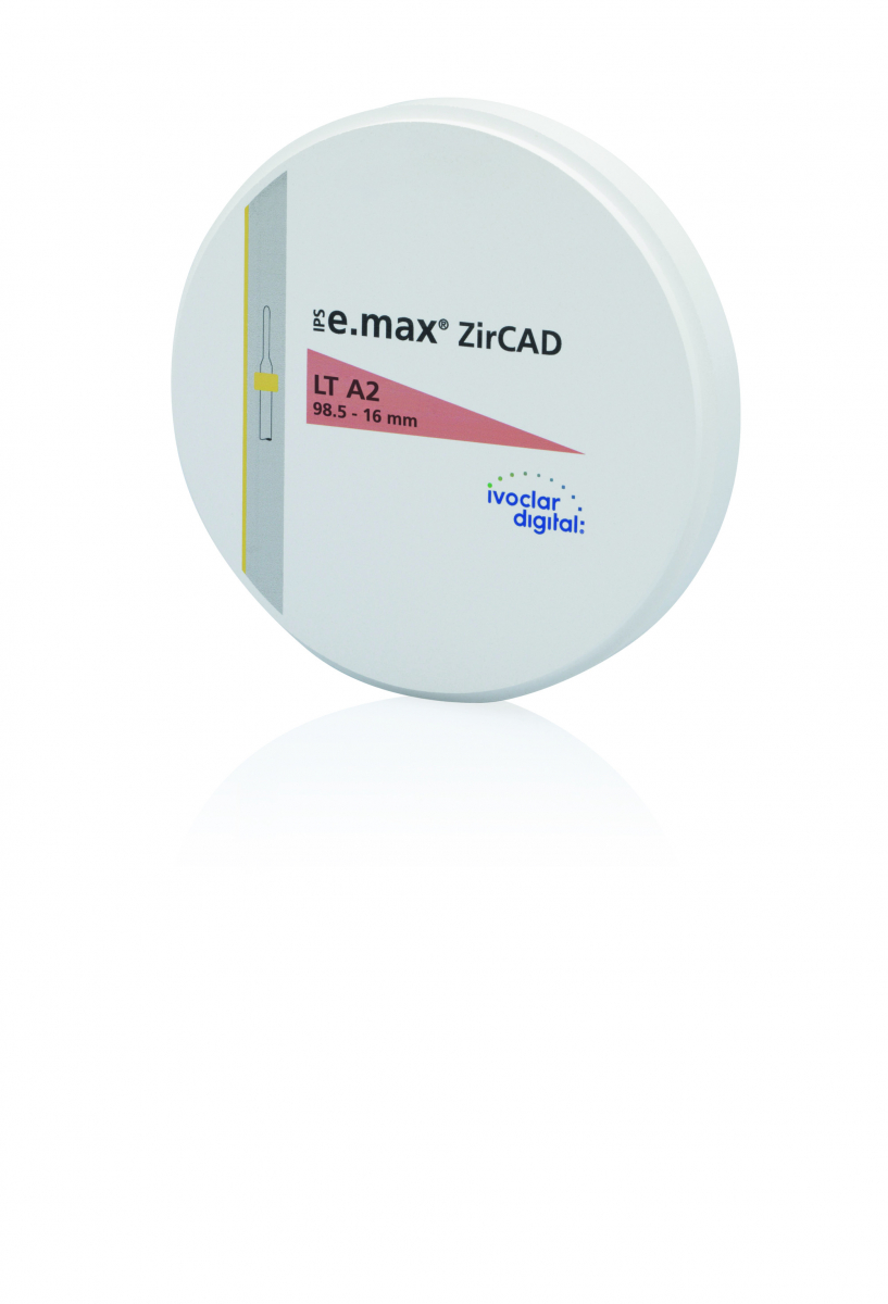 IPS e.max ZirCAD LT sono dischi monocromatici, altamente resistenti (1200Mpa), disponibili nella variante in bianco oppure nella variante precolorata dei gruppi di colore A-D.