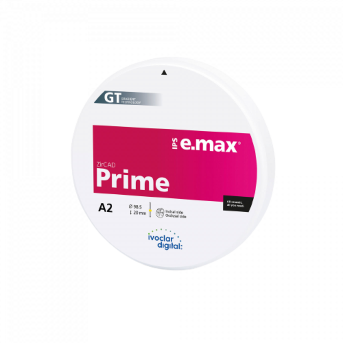 Dischi in ossido di Zirconio. Il rivoluzionario materiale consente di ottenere eccezionali livelli di qualità ed estetica e grazie alla sua elevata resistenza è impiegabile per tutte le indicazioni: pittura, cut back, Rivestimento estetico ed infiltrazione, dalla corona singola fino al ponte di 14 elementi. La Gradient Technology (GT) che trova impiego nella produzione di IPS e.max ZirCAD Prime è una nuova tecnologia di produzione, unica nel suo genere, che combina in modo speciale le materie prime altamente resistenti: 3Y-TZP (ZrO2 condizionato nell’area dentinale -1200 Mpa) e 5Y-TZP (ZrO2 altamente traslucente in area incisale 650 Mpa). I restauri in IPS e.max ZirCAD Prime si possono elaborare con programmi di sinterizzazione rapidi. L’eccellente estetica è caratterizzata dal reale decorso di colore e traslucenza privo di strati nonché dall’ottimizzata traslucenza. In questo modo, anche senza caratterizzazione si può ottenere un restauro dall’aspetto naturale. Questi impressionanti risultati sono resi possibili, non per ultimo, anche grazie alla precisa colorazione del materiale. Diametro 98,5 mm