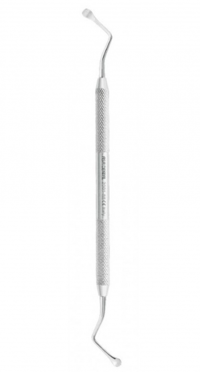 La lama concava “a cucchiaio” è sagomata conformemente alla figura 87, progettata per adattarsi all’interno delle cavità alveolari post-estrattive, facilitando la rimozione di tessuti molle residui, frammenti ossei e detriti all’interno dell’alveolo.