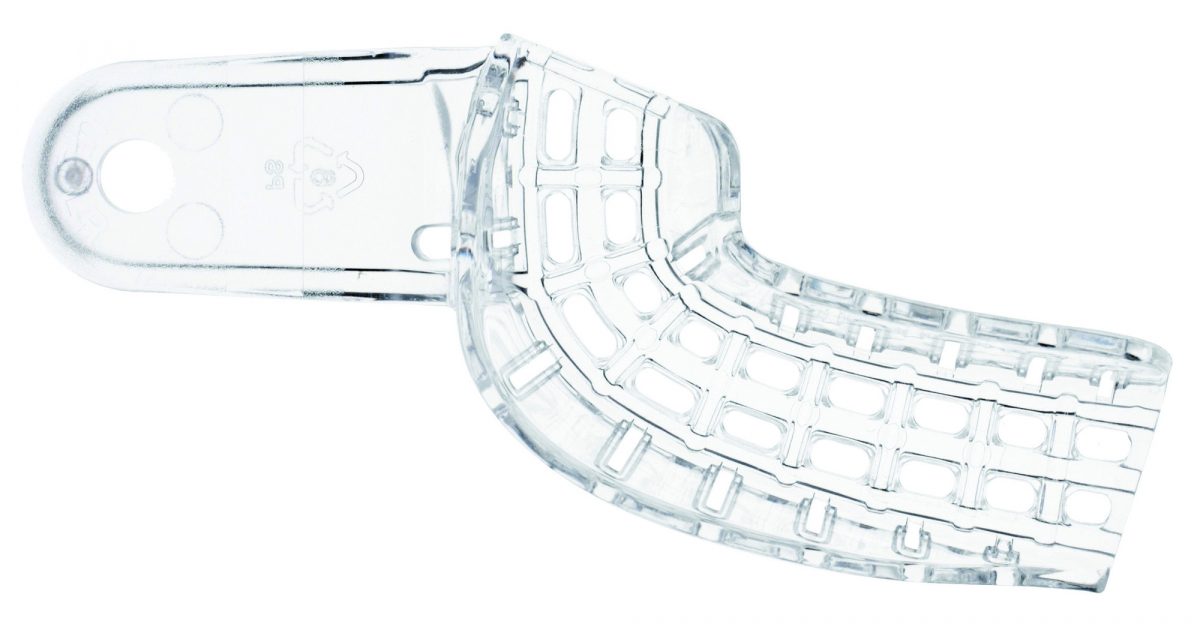 PORTAIMPRONTE PRESIDENT Portaimpronte in materiale plastico riciclabile, con struttura perforata, modificabili ammorbidendole con il calore. Compatibili con tutti i tipi di materiale da impronta e disinfettabili a freddo. Trasparenti, monouso. Confezione: 12 pezzi Misura 7 - quadrante superiore sinistro/ inferiore destro