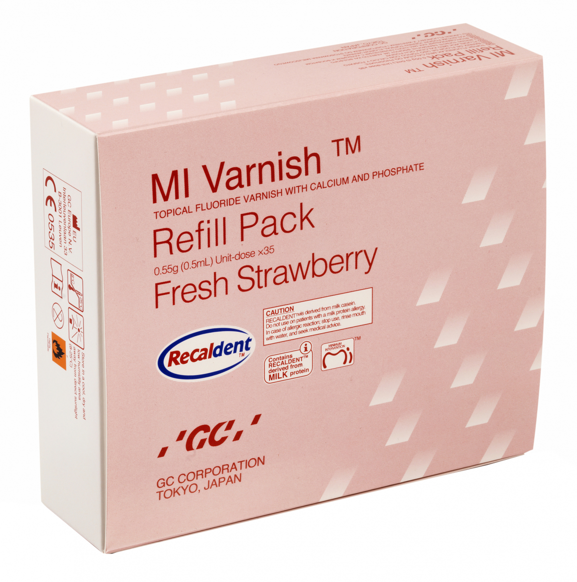 MI VARNISH Vernice protettiva e desensibilizzante contenente calcio, fosfato e fluoro biodisponibili per la protezione dello smalto; oltre al fluoro (22600 ppm) contiene il 2% di Recaldent CPP-ACP (caseina fosfopeptide - fosfato di calcio amorfo). Semplice da applicare, indurisce a contatto della saliva. Colore bianco avorio che non altera l'estetica del dente. Ogni confezione monodose da 0,5 ml è sufficiente per trattare l'intera dentatura di un adulto. Disponibile in due gradevoli aromi: menta e fragola. Confezione: 35 monodosi da 0,5 ml cad.(gusto fragola) + 50 pennelli