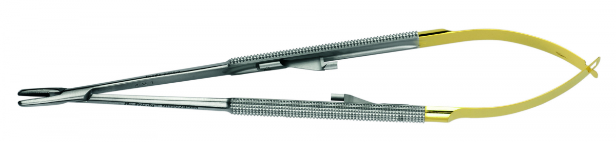 Porta aghi Castroviejo Dott. Simion, serie Permasharp con inserti in carburo di tungsteno. Dritto, con manico rotondo. Lunghezza 18 cm. Adatto per suture 3-0 e 4-0.