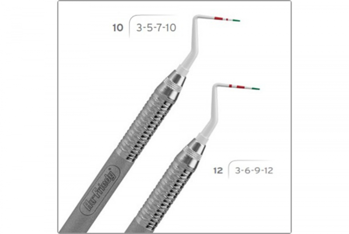 -1 Sonda PerioScreen dotata di: sistema di codifica millimetrica a colori rosso e verde di facile lettura, comodo manico ergonomico, estremità di lavoro sostituibili.