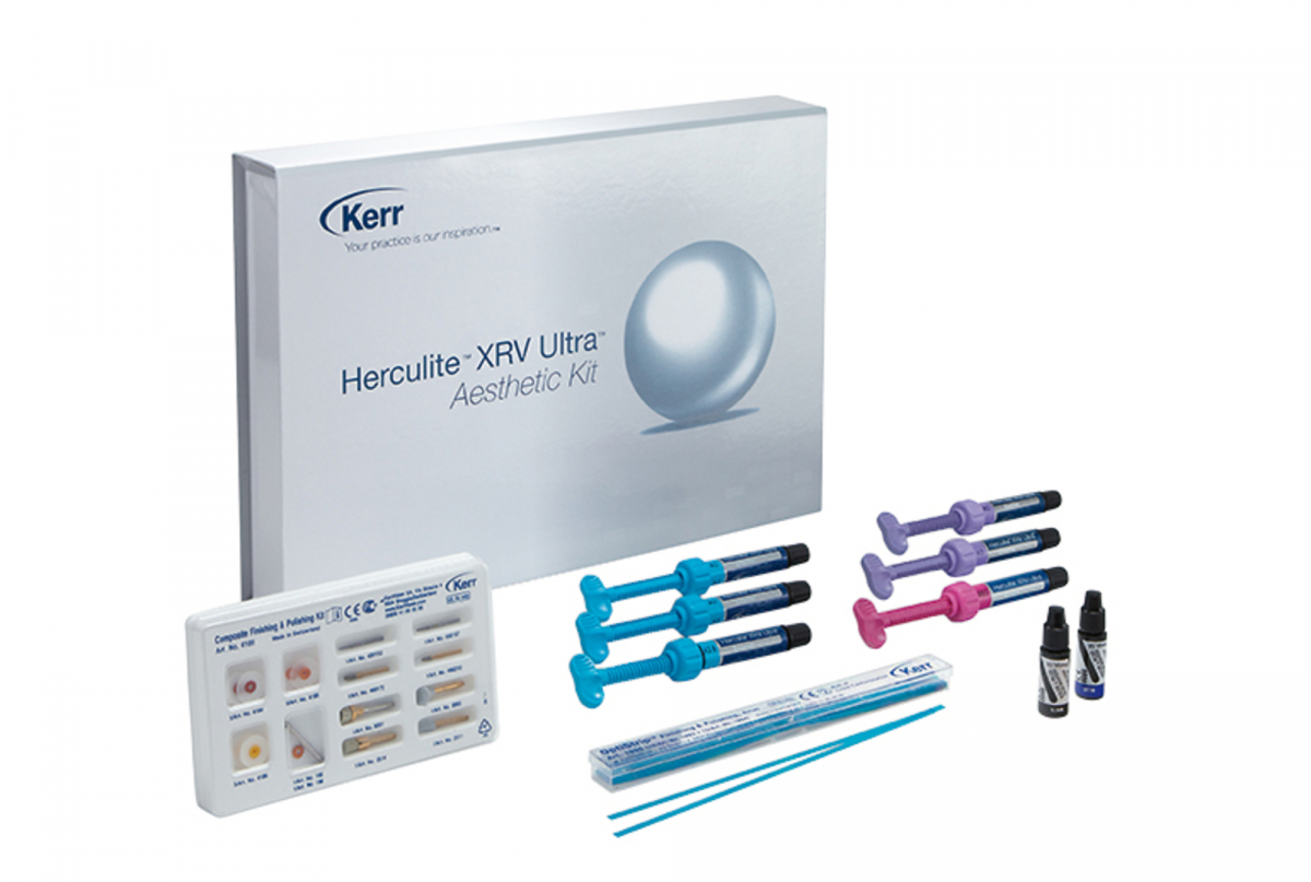 HERCULITE XRV ULTRA "AESTHETIC KIT" Kit contenente compositi e strumenti necessari alla realizzazione di restauri altamente estetici, sia con tecnica a due strati che con tecnica multistrato. Dispone inoltre di una "Guida alla stratificazione" che fornisce le indicazioni necessarie ad una corretta stratificazione. Aesthetic Kit: 6 siringhe da 4 gr cad. (smalto colori A2, A3, A3.5; dentina colori A2, A3; Medium Incisale) + 2 flaconi di Kolor Plus (colori Bianco e Blu) + Kit di rifinitura e lucidatura (15 strisce OptiStrip grana media + 15 strisce OptiStrip grana fine + 5 Optidisc Coarse-Medium + 5 Optidisc Fine + 5 Optidisc Extra-Fine + 1 spazzolino Occlubrush + 1 spazzolino Optishine + 1 Dia1Step Disco + 1 Dia1Step Fiamma + 2 frese diamantate, 1 cilindrica a testa arrotondata FG 4062 F e 1 cilindrica a testa arrotondata FG 5062 UF, + 2 frese carburo di tungsteno, 1 forma ago FG 7902 e 1 forma ago lunga FG 9903)