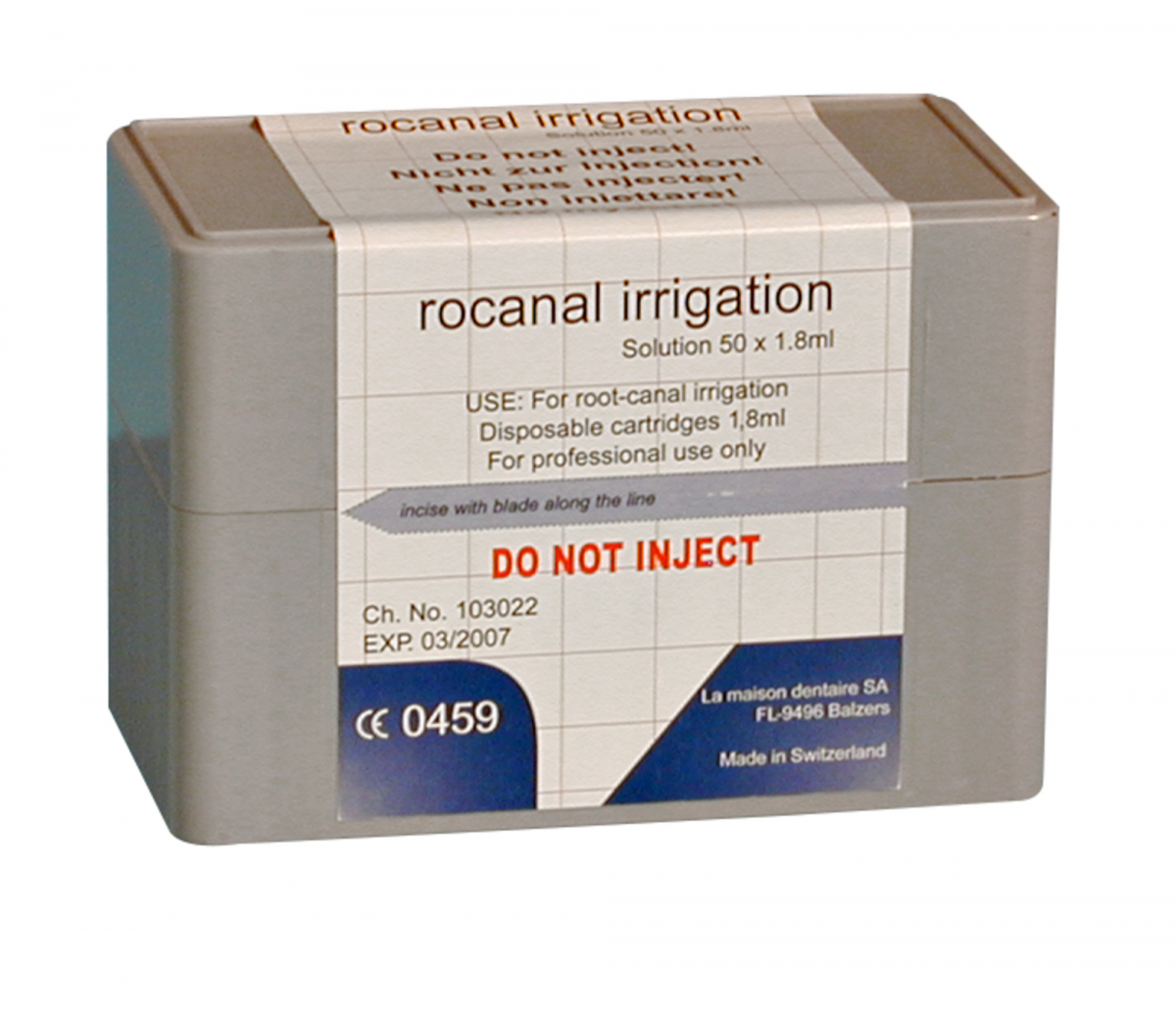 ROCANAL IRRIGATION Soluzione idroalcolica, a base di benzetonio cloruro ed E.D.T.A., per la pulizia, il lavaggio e la lubrificazione dei canali radicolari. Non danneggia la mucosa orale ed è indolore oltre apice. Confezione: 50 tubofiale da 1,8 ml cad.