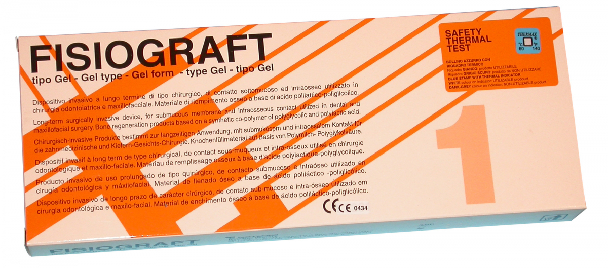 FISIOGRAFT Riempitivo osseo, a base di acido polilattico e poliglicolico. Riassorbibile, è disponibile in versione gel, polvere o spugna, a seconda delle varie esigenze. Sterili, monouso. Fisiograft gel: 1 siringa da 500 mg