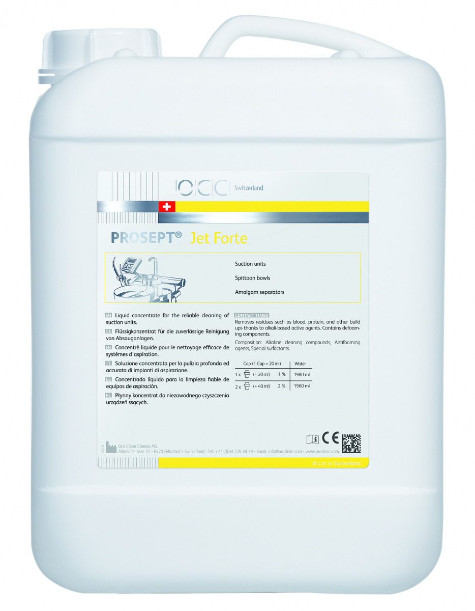 PROSEPT JET FORTE Preparato concentrato a base di detergenti alcalini, agenti antischiumogeni e tensioattivi, privo di aldeidi, per la cura e la pulizia degli impianti d'aspirazione, sputacchiere e dei separatori d'amalgama. Diluizione: 2%. Flacone da 5 Lt