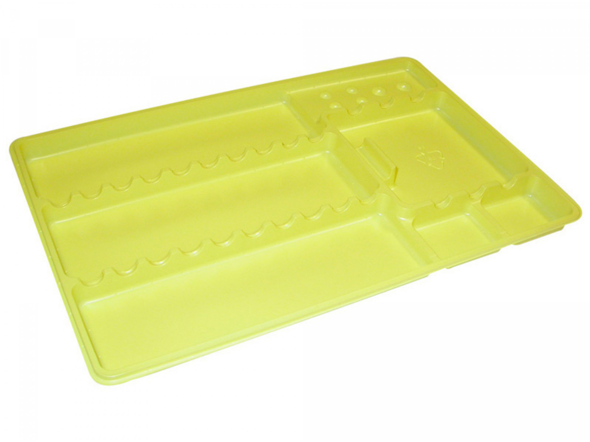 TRAY MONOUSO Vassoi monouso per vaschette in alluminio, mini-vassoi e vassoi. In plastica atossica, resistono agli acidi ed ai liquidi per cementi. Biodegradabili, sono disinfettabili a freddo. TRAY LISCI: misura 28,6x1,7x18,8 cm (LxHxP). Confezione: 400 pezzi - Colore Giallo