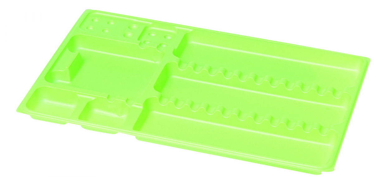 TRAY MONOUSO Vassoi monouso per vaschette in alluminio, mini-vassoi e vassoi. In plastica atossica, resistono agli acidi ed ai liquidi per cementi. Biodegradabili, sono disinfettabili a freddo. TRAY LISCI: misura 28,6x1,7x18,8 cm (LxHxP). Confezione: 400 pezzi - Colore Verde