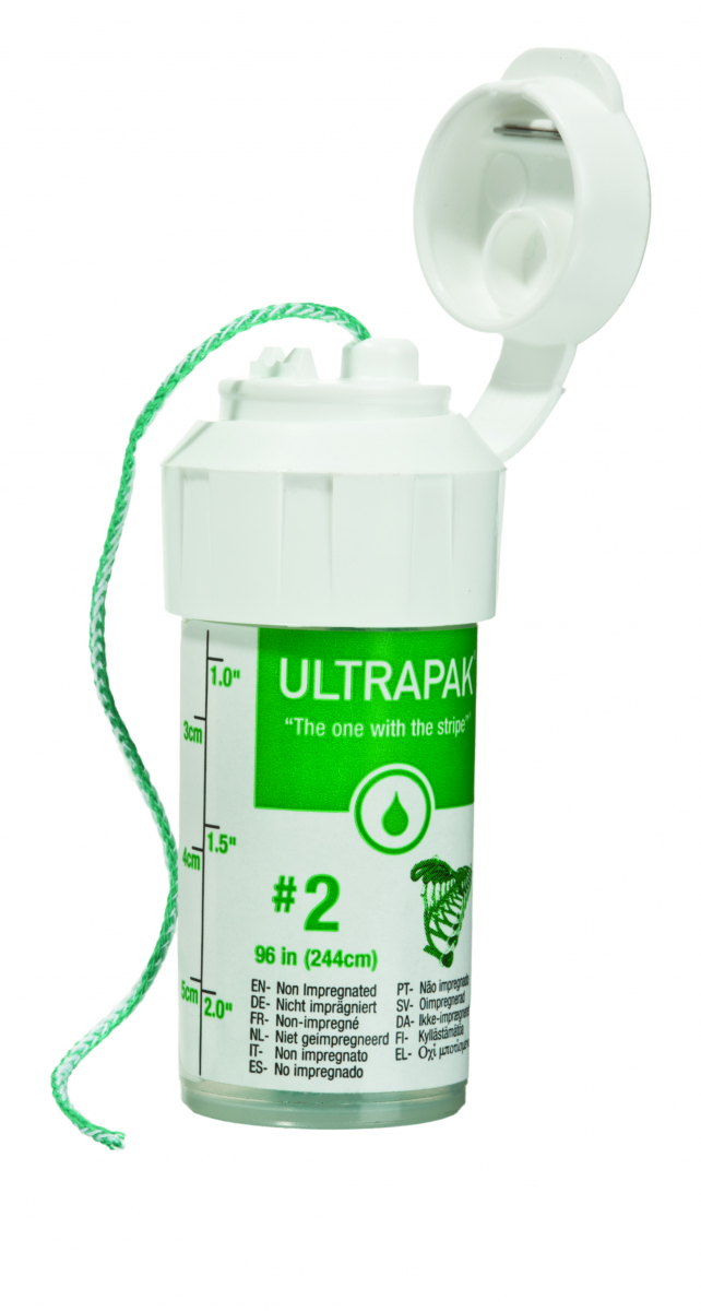 ULTRAPAK CLEANCUT Filo per retrazione a maglie concatenate, in cotone al 100%. La particolare forma tubolare offre una serie di vantaggi: Ultrapak è facile da posizionare, non si sfrangia ed ha un'elevata capacità di assorbimento. Non impregnato, può essere imbevuto con liquido a scelta. Versione CleanCut che permette di avere nel rocchetto una taglierina incorporata per tagliare direttamente il filo. Lunghezza filo 244 cm. Colore verde - Misura 2
