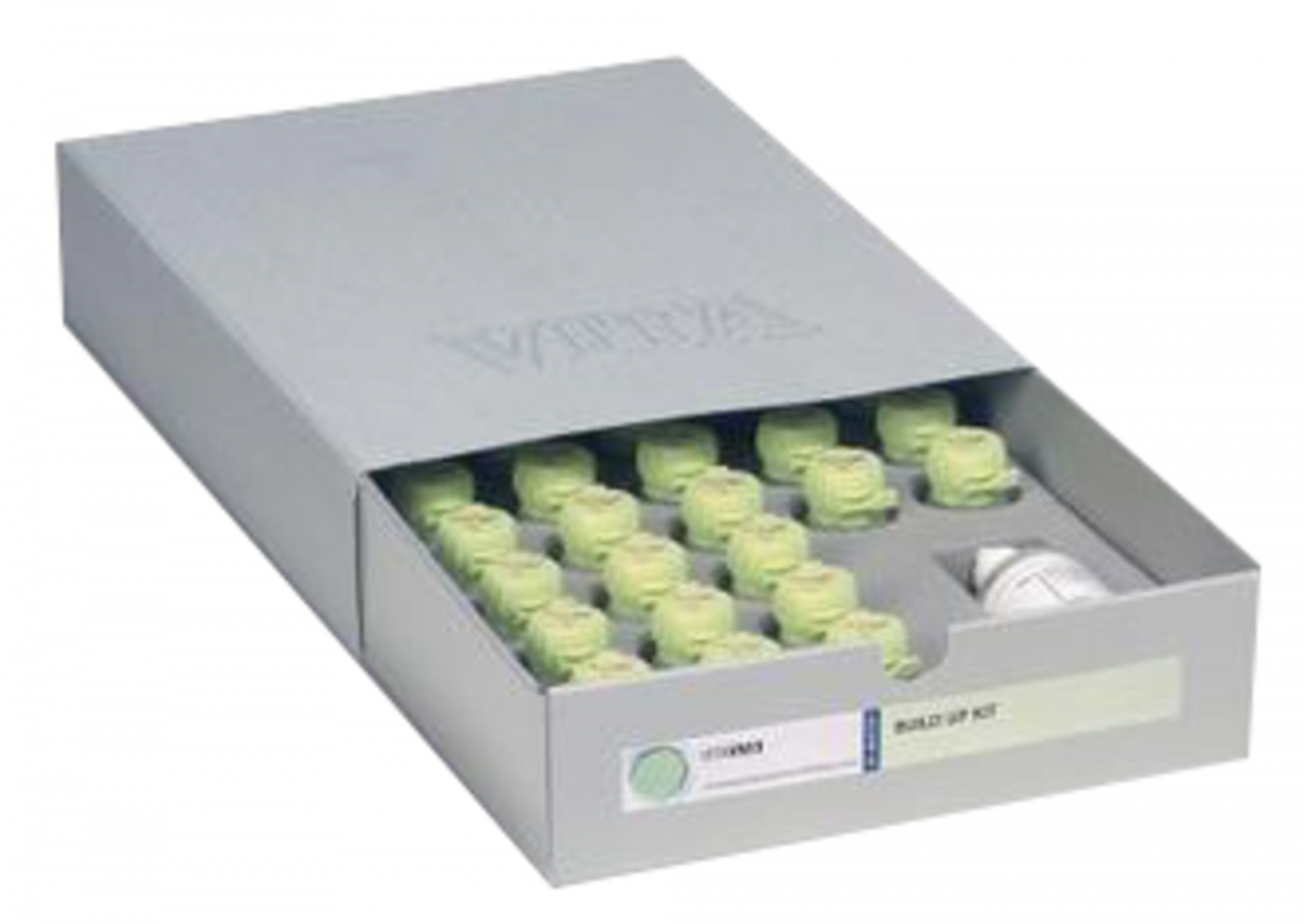 VITA VM9 Speciale ceramica di rivestimento a microstruttura per strutture in ZrO2 parzialmente stabilizzato con ittrio: ottimo comportamento di ritrazione e riflessione della luce simile allo smalto naturale. VM 9 BUILD UP KIT - Contenuto: 26 dentine da 12 gr (colori 1M1,1M2,2L1.5,2L2.5,2M1,2M2,2M3,2R1.5, 2R2.5,3L1.5,3L2.5,3M1,3M2,3M3,3R1.5,3R2. 5,4L1.5,4L2.5,4M1,4M2,4M3,4R1.5,4R2.5,5M 1,5M2,5M3) + 1 liquido modellazione da 50 ml + istruzioni d'uso