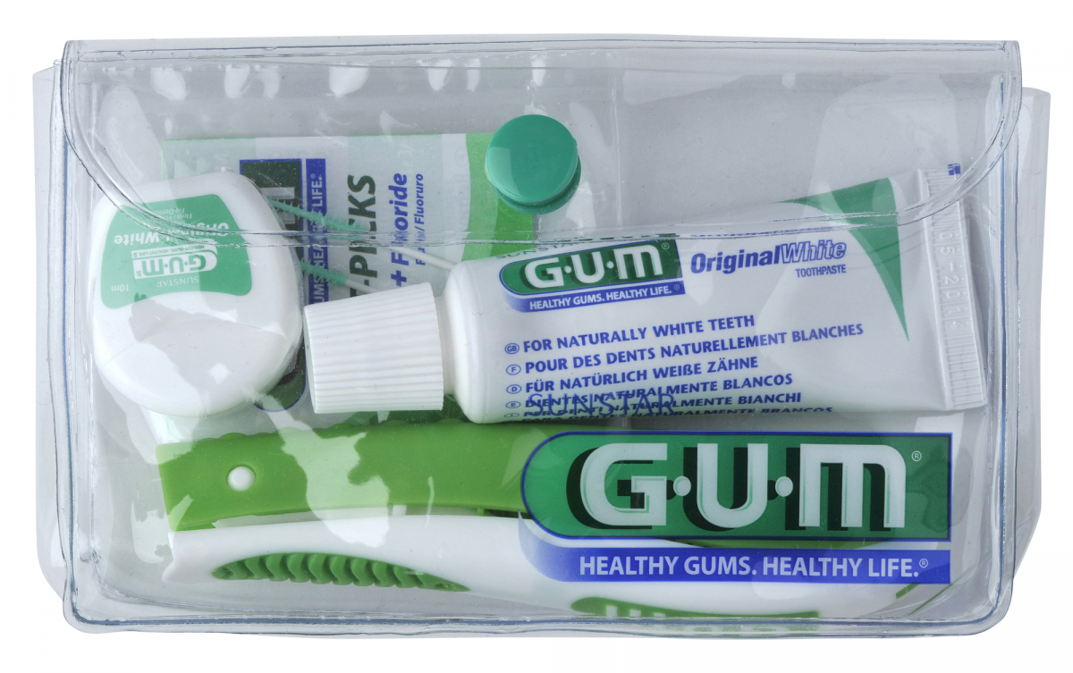 GUM TROUSSE DA VIAGGIO Confezione composta da: 1 spazzolino da viaggio con setole impregnate con clorexidina + dentifricio Caries Protect da 12 ml + 1 filo Butler Weave cerato da 11 metri