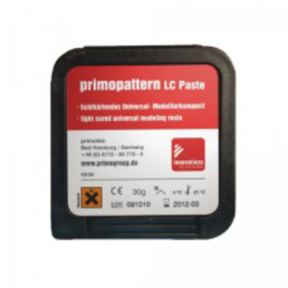 PRIMOPATTERN LC - Apex Dental Resina fotopolimerizzante monocomponente , pronta all'uso, particolarmente adatta per modellazioni rapide di tutti i tipi di fusioni, impianti, fresaggi, corone secondarie e per tutte le tecniche di sp linting. Consistenza e viscosità sono bi lanciate e la stabilità dimensionale ass oluta, per un risultato eccezionalmente preciso; tissotropico, di facile applica zione, è caratterizzato da un lungo temp o di lavorabilità (> 20 min.) ed un brev e tempo di polimerizzazione (< 5 min.). Grande durezza superficiale, rimozione s enza distorsione e stress, brucia comple tamente senza residui. Disponibile in ge l e in pasta, per un'applicazione facile e sicura. Primopattern LC Paste: confezione da 30 gr