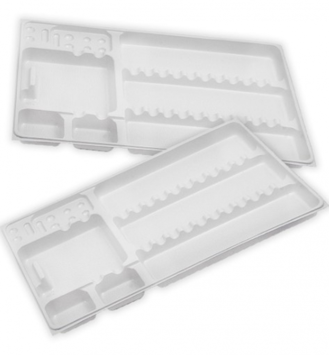 400 vassoi monouso, 18 x 14 cm, Plastica rigida (polistirolo), bianchi e lisci, senza zigrinatura. Il fondo liscio facilita la pulizia e l'organizzazione degli strumenti durante le procedure odontoiatriche. La plastica rigida garantisce una buona resistenza agli urti e una lunga durata.