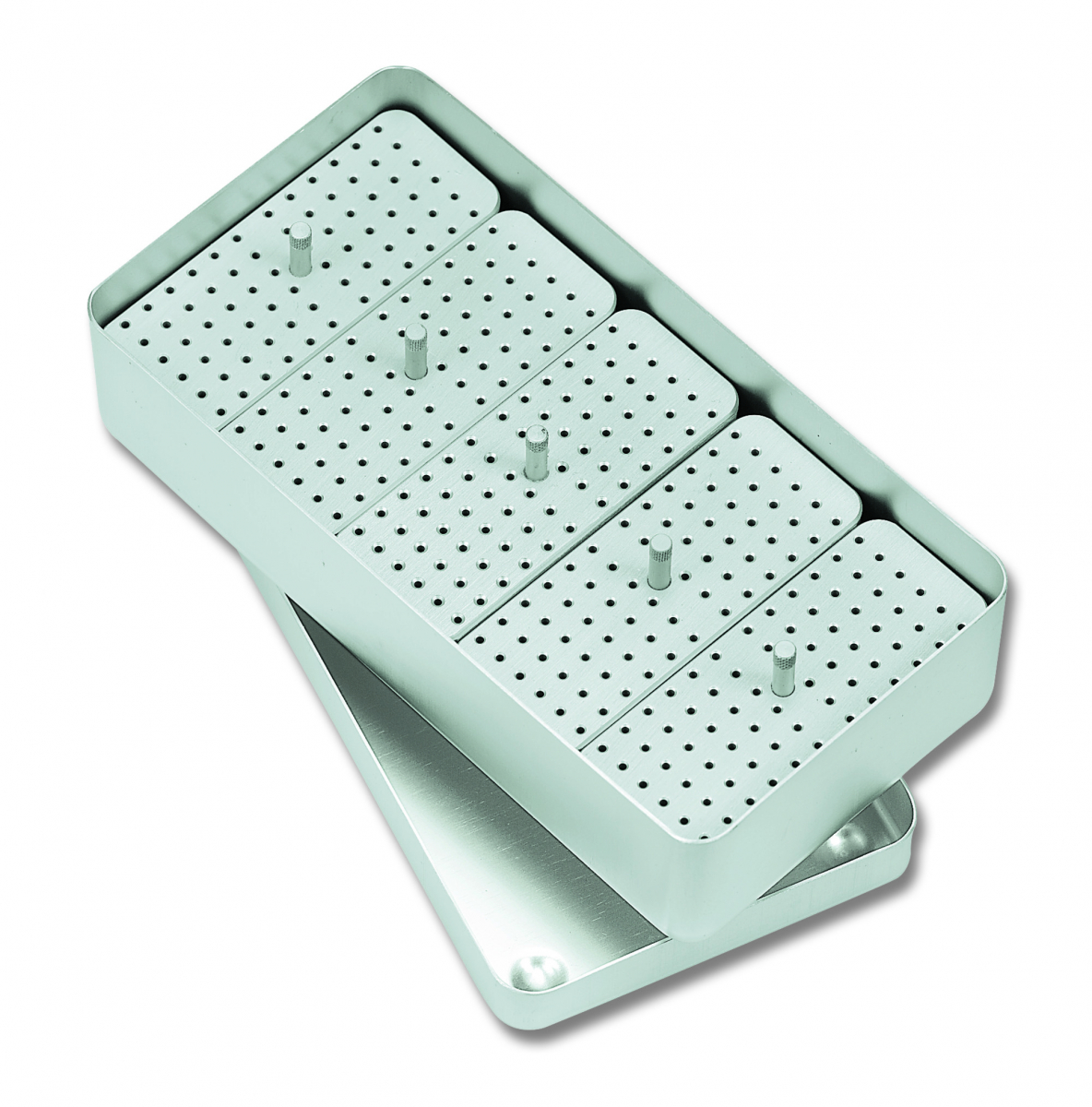 ENDO MAXI BOX Contenitore per endodonzia, in alluminio anodizzato. Provvisto di coperchio. Modello costituito da 5 mini-trays, per strumenti canalari - Colore argento. Rettangolare. Misura 204x105x54 mm. Confezione: 1 pezzo