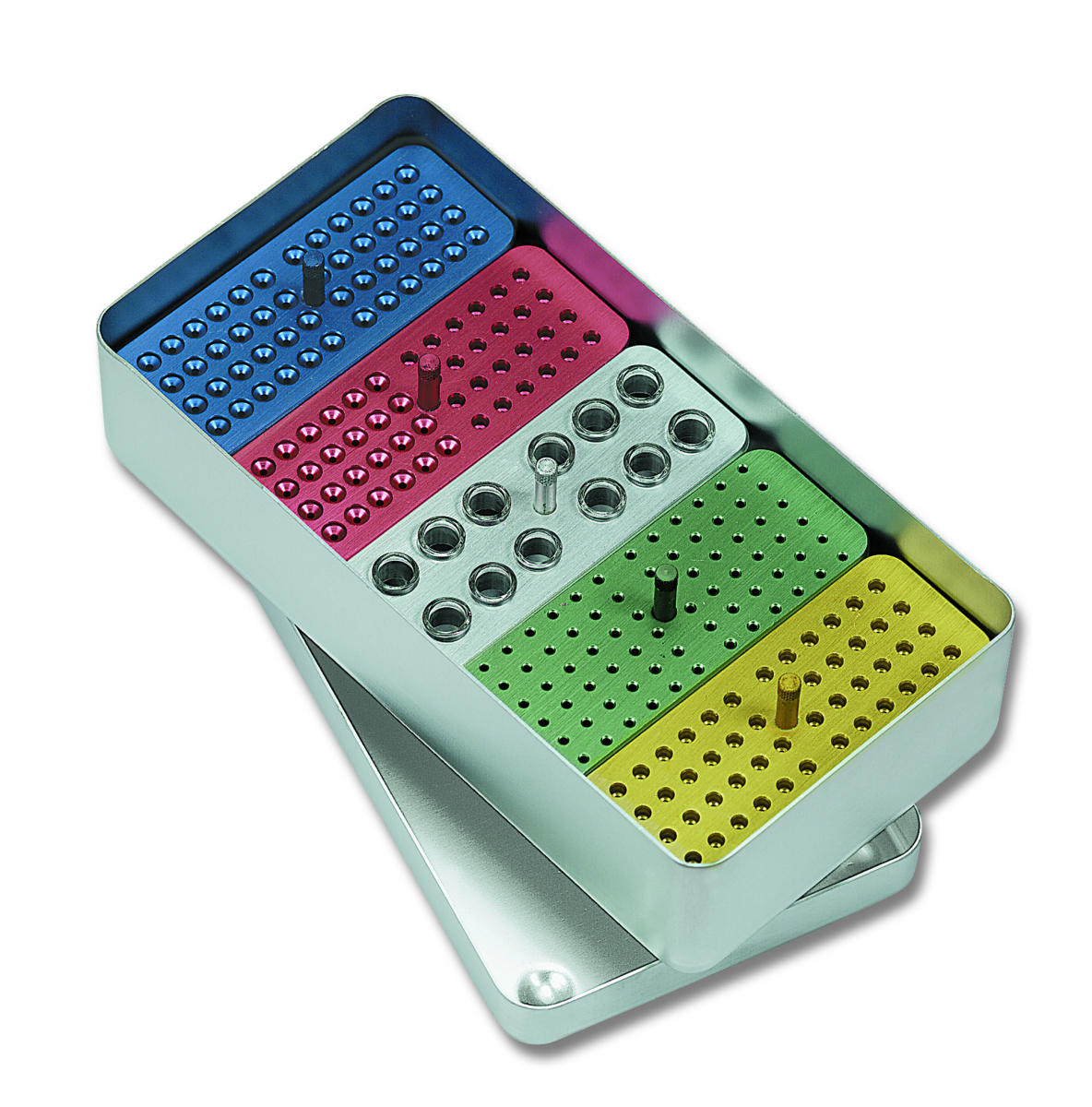 ENDO MAXI BOX Contenitore per endodonzia, in alluminio anodizzato. Provvisto di coperchio. Modello misto costituito da 5 mini- trays, per coni di carta/guttaperca e per strumenti canalari - Colore argento, interno di vari colori. Rettangolare. Misura 204x105x54 mm. Confezione: 1 pezzo