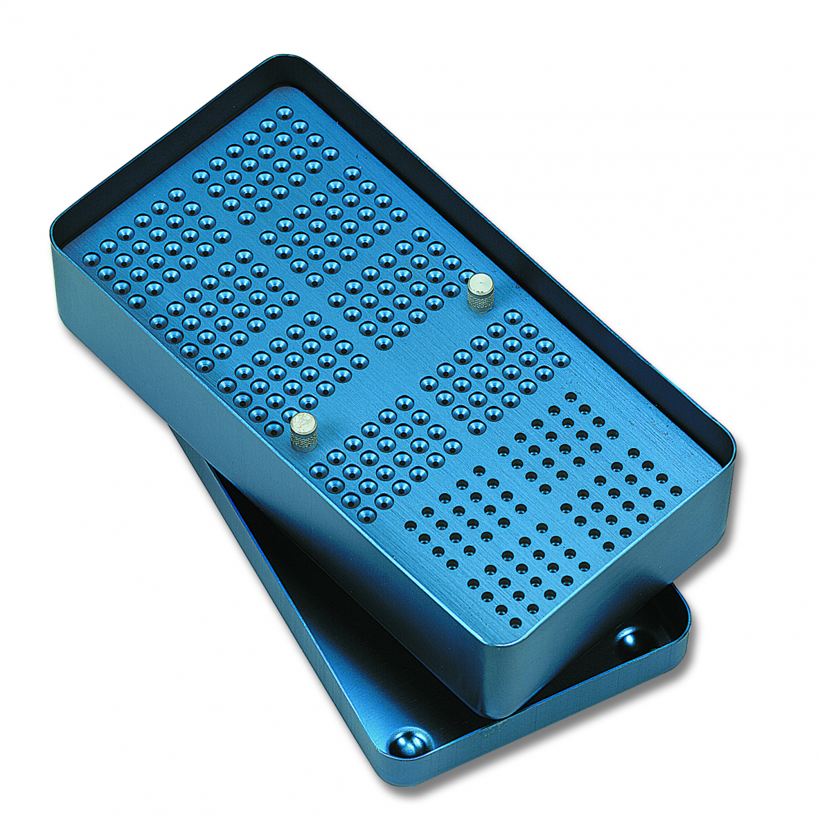 ENDO MAXI BOX Contenitore per endodonzia, in alluminio anodizzato. Provvisto di coperchio. Modello costituito da un unico tray, per strumenti canalari - Colore blu. Rettangolare. Misura 204x105x54 mm. Confezione: 1 pezzo