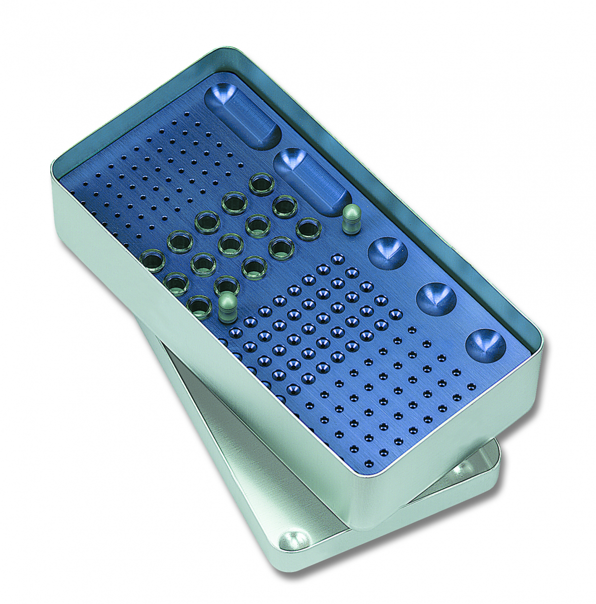 ENDO MAXI BOX Contenitore per endodonzia, in alluminio anodizzato. Provvisto di coperchio. Modello misto costituito da un unico tray, per coni di carta/guttaperca e per strumenti canalari - Colore argento, interno blu. Rettangolare. Misura 204x105x54 mm Confezione: 1 pezzo