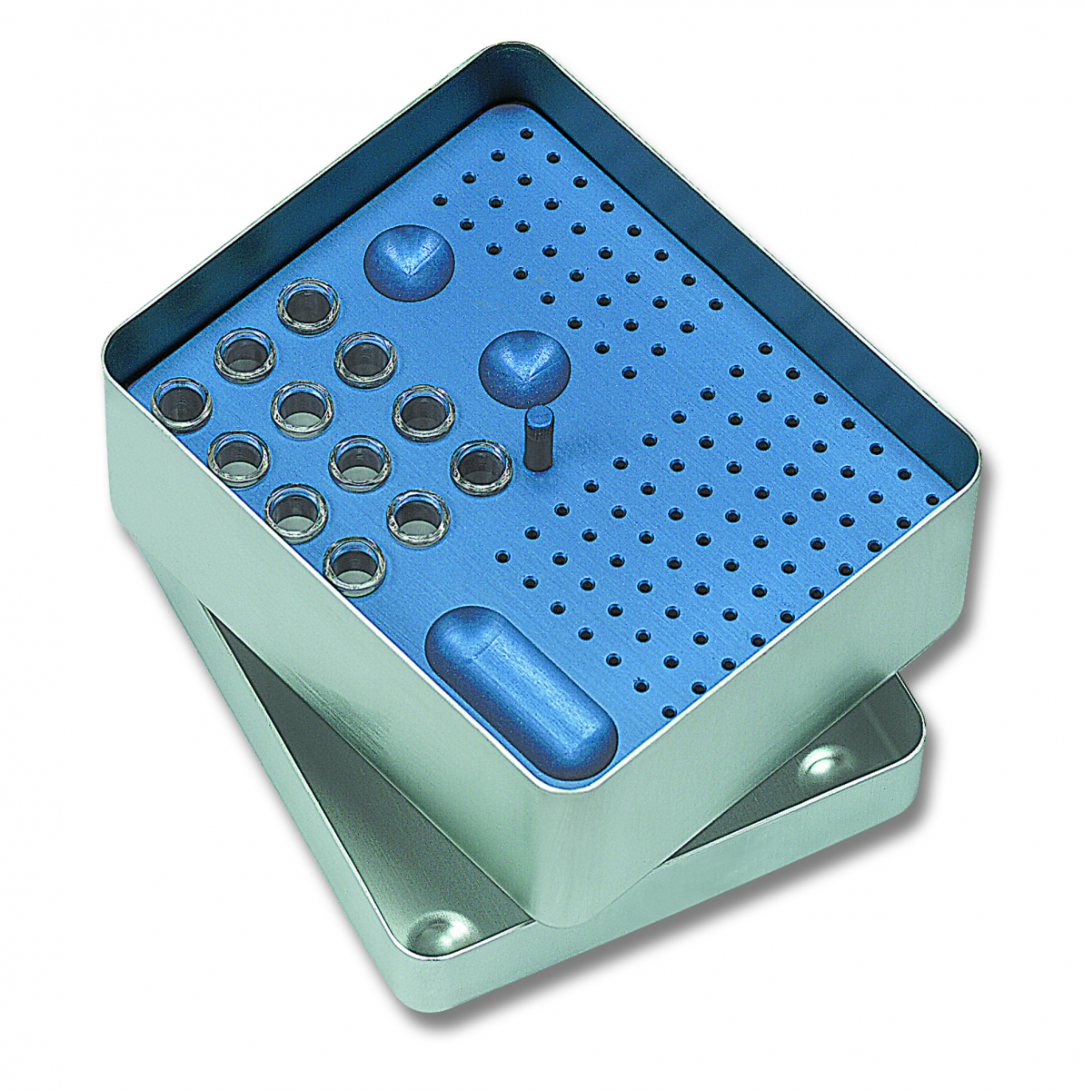 ENDO MIDI BOX Contenitore per endodonzia, in alluminio anodizzato. Provvisto di coperchio. Modello misto, costituito da un unico tray, per coni di carta/guttaperca e per strumenti canalari - Colore argento, interno blu. Rettangolare. Misura 125x105x54 mm. Confezione: 1 pezzo