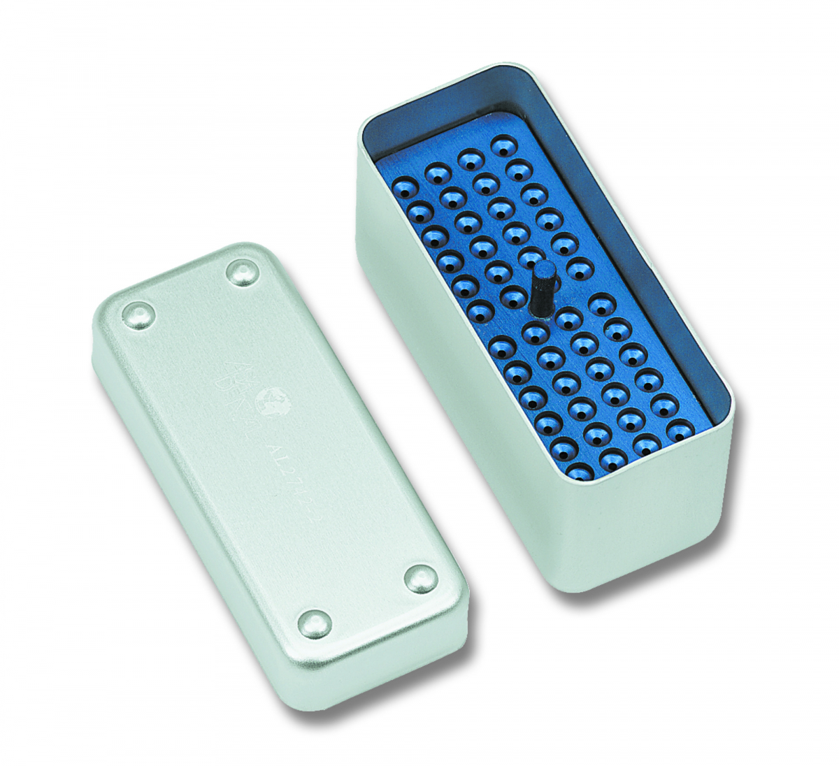 ENDO MINI BOX Contenitore per endodonzia, in alluminio anodizzato. Provvisto di coperchio. Modello per strumenti canalari - Colore argento, interno blu. Rettangolare. Misura 100x44x54 mm. Confezione: 1 pezzo