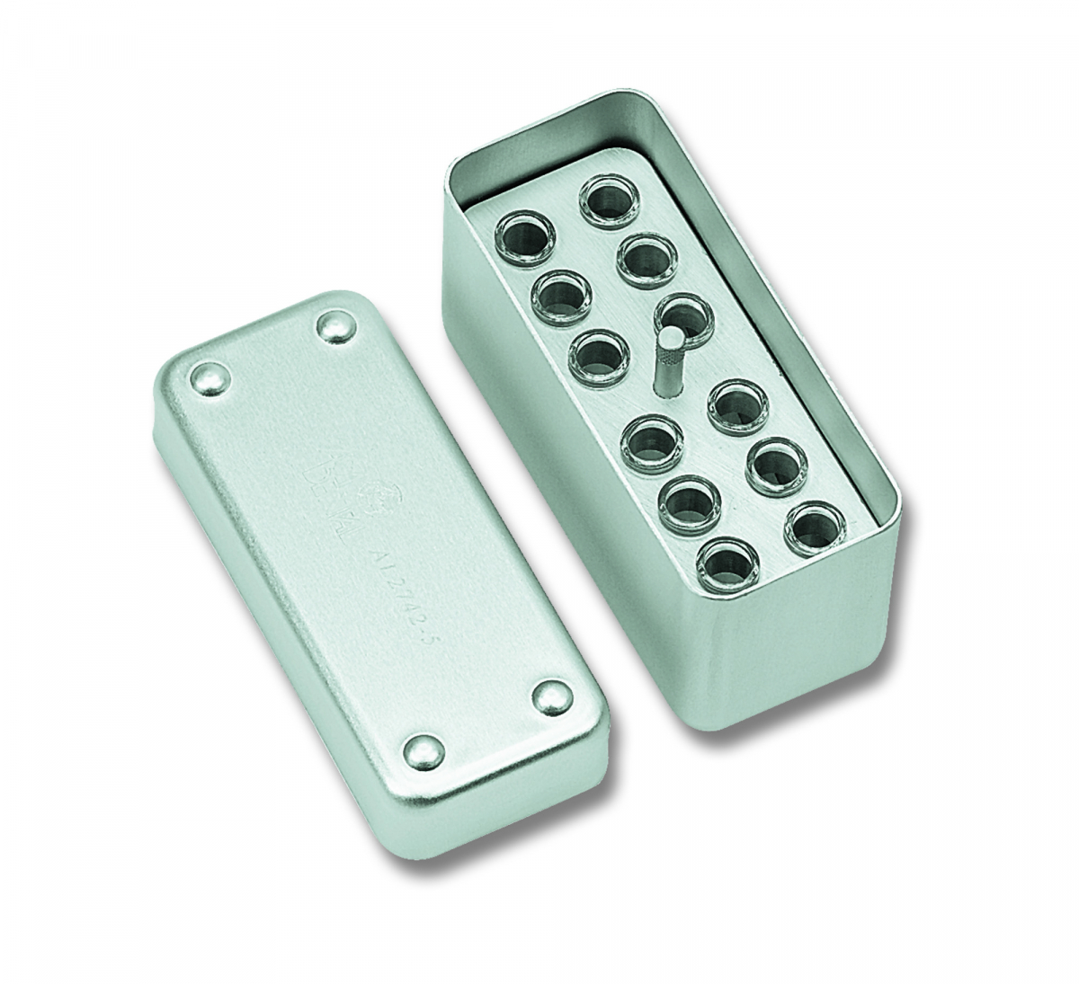 ENDO MINI BOX Contenitore per endodonzia, in alluminio anodizzato. Provvisto di coperchio. Modello per coni di carta/guttaperca - Colore argento. Rettangolare. Misura 100x44x54 mm. Confezione: 1 pezzo